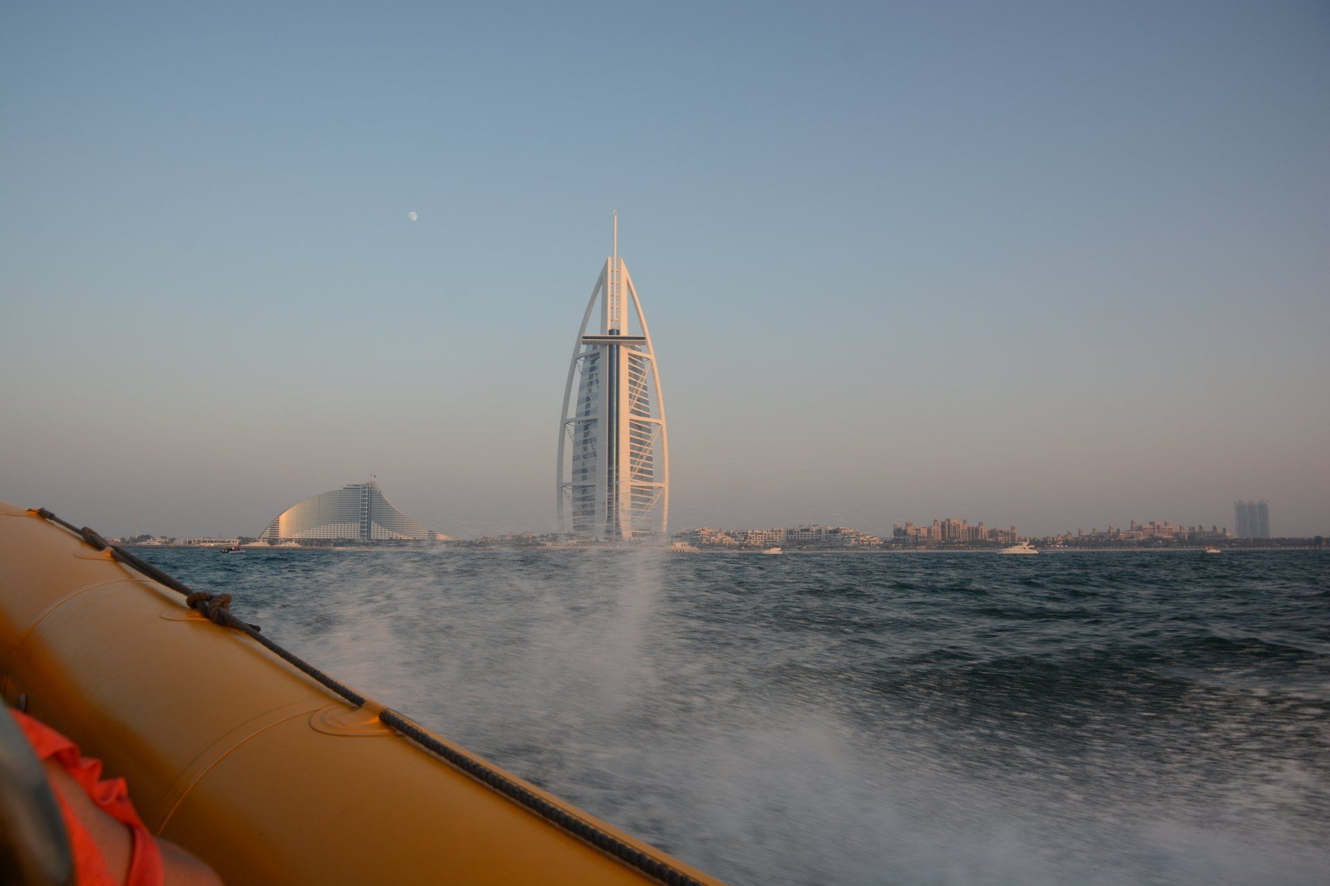 Von hier aus startet dann unsere Bootstour mit den "Yellow Boats" in Richtung Sonnenuntergang. Zuerst ging es erst einmal in die Dubai Marina, um die atemberaubende Aussicht auf die Skyline der Marina zu geniessen. Nochmals vorbei an all den Hochhäusern, die wir gerade schon bestaunt haben. Dann ging es so langsam hinaus auf das offene Meer. Gut festhalten, jetzt wird Speed zugegeben - und endlich weht uns auch eine frische Brise um die Nase. Ja, so gefällt uns das.