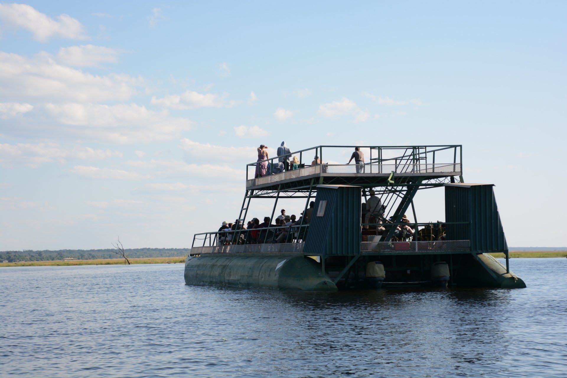 Der Shuttle ist auch dieses Mal pünktlich und dann geht es zur Bootsanlegestation. Tja, wir haben uns da eher ein kleines schnuckeliges Boot vorgestellt, mit dem wir schön idyllisch den Zambezi entlang schippern, Tiere beobachten können mit einem Sundowner zum Abschluss. Mit einem riesigen Schiff für 80 (in Worten: achtzig) Personen haben wir nicht gerechnet. Die Getränke sind inklusive und für einige Mitreisende scheint das der Hauptgrund für die Bootstour gewesen zu sein – die haben ganz schön zugelangt und sich entsprechend aufgeführt.