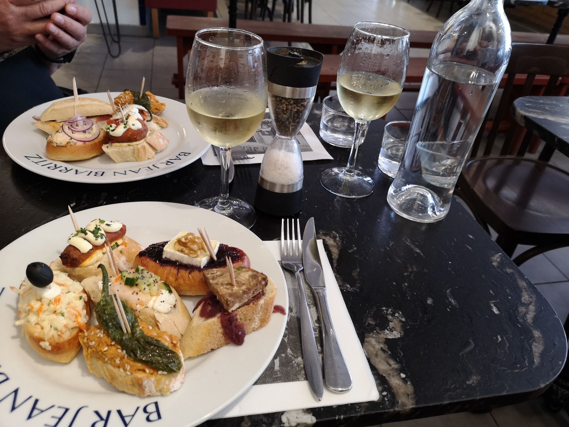 San Sebastián ist bekannt für seine gute Küche. Nirgendwo gibt es mehr Michelin-Sterne pro Quadratmeter als hier, heißt es. Aber warum ein teures Sterne-Restaurant aufsuchen? Die leckeren Kleinigkeiten gibt es hier an jeder Ecke. Die Theken der Bars sind voll der Köstlichkeiten: Tapas heißen hier Pinchos oder baskisch Pintxos (ausgesprochen “Pintchos”). Jedes Pincho ist sorgfältig mit einem Zahnstocher fixiert. Dazu trinkt man ein Gläschen Txakolí, den trockenen Weißwein der Gegend.
