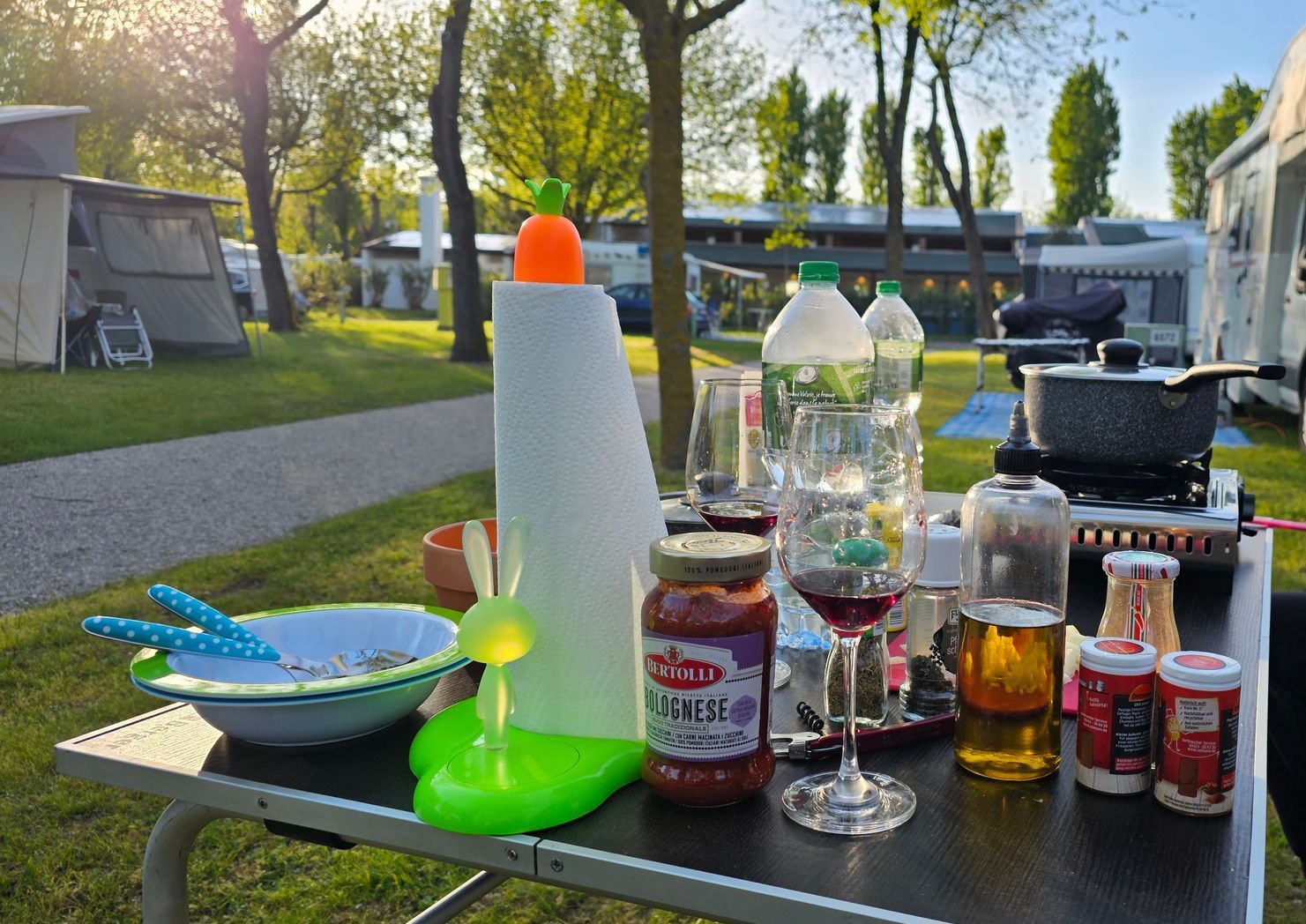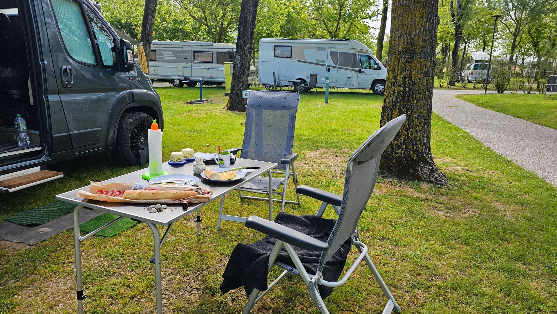 Normalerweise schreckt uns so ein Platz ja eher ab und von alleine wären wir sicherlich nie und nimmer auf die Idee gekommen, hier zwei Wochen zu verbringen. Das schöne am Platz ist tatsächlich, dass die einzelnen Bereiche durch Hecken, Strassen und Wege so voneinander getrennt sind, dass man eher das Gefühl hat, auf einem kleineren Platz zu sein. Überall hat es Bäume und geweckt wird man von Vogelgezwitscher. Morgens gibt es Brötchen und Baguette (in italienischer "Qualität"), der Supermarkt hat eine grosse Auswahl und die Restaurants sind auch in Ordnung. Entlang den Lagunen gibt es schöne Fahrradwege, man kann am Strand entlang spazieren, wer mag kann mit dem Wassertaxi nach Venedig fahren. Wir haben nach unserem anstrengenden Umzug etwas Erholung gebraucht und somit war dieser Platz eigentlich perfekt für uns. Und wer jetzt denkt, der Platz kostet sicherlich ein kleines Vermögen: Nein, tut er nicht. Zumindest nicht in der Nebensaison. Wir haben für 14 Tage 400 Euro bezahlt - keine 29 Euro pro Nacht für zwei Personen. Praktisch ein Schnäppchen.