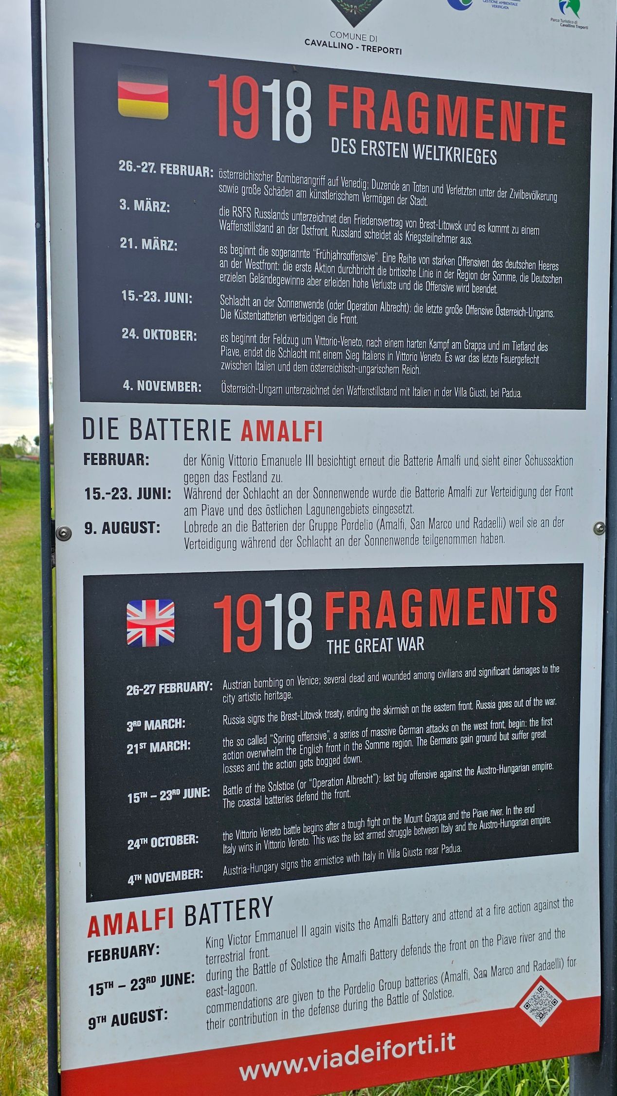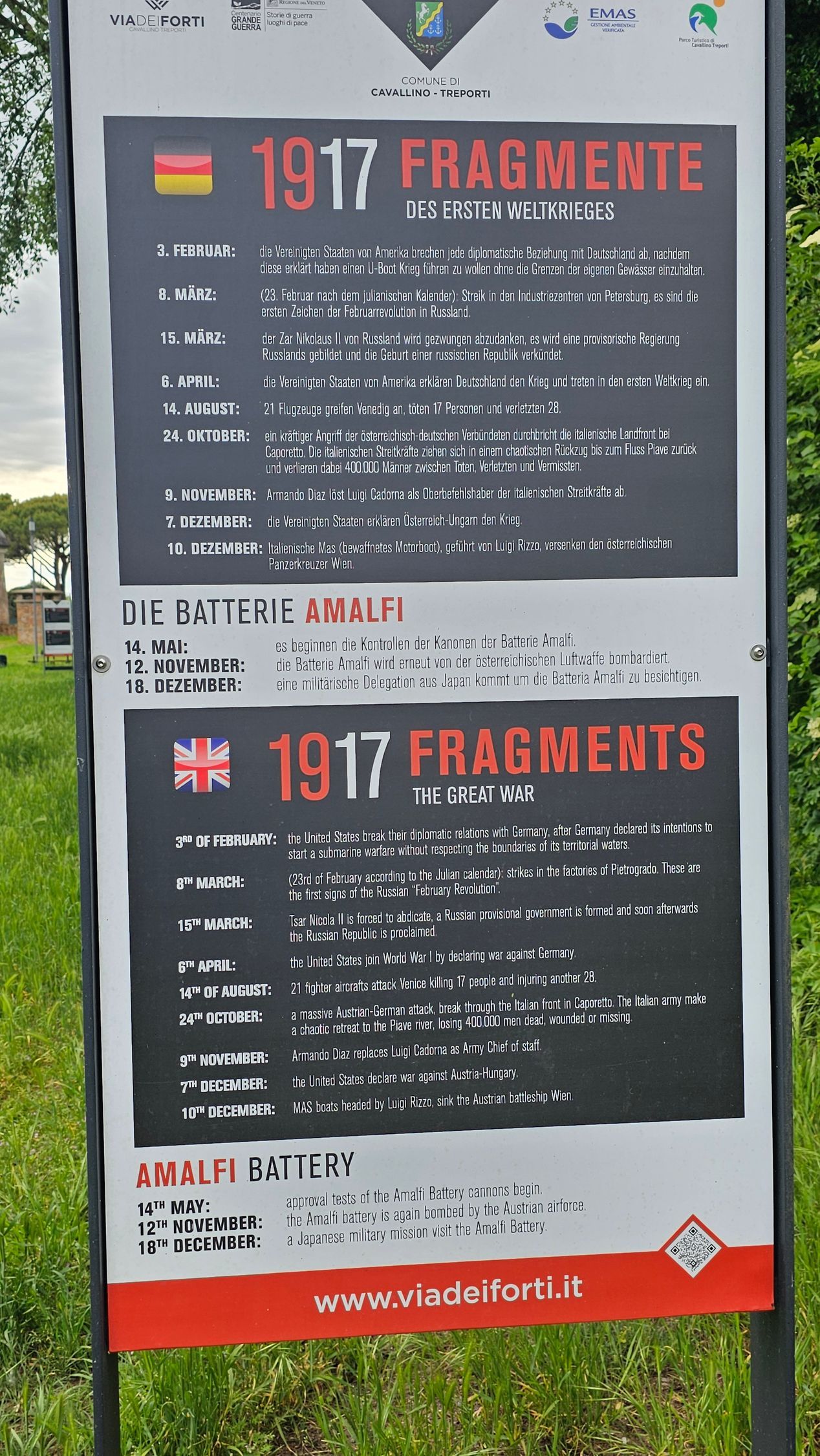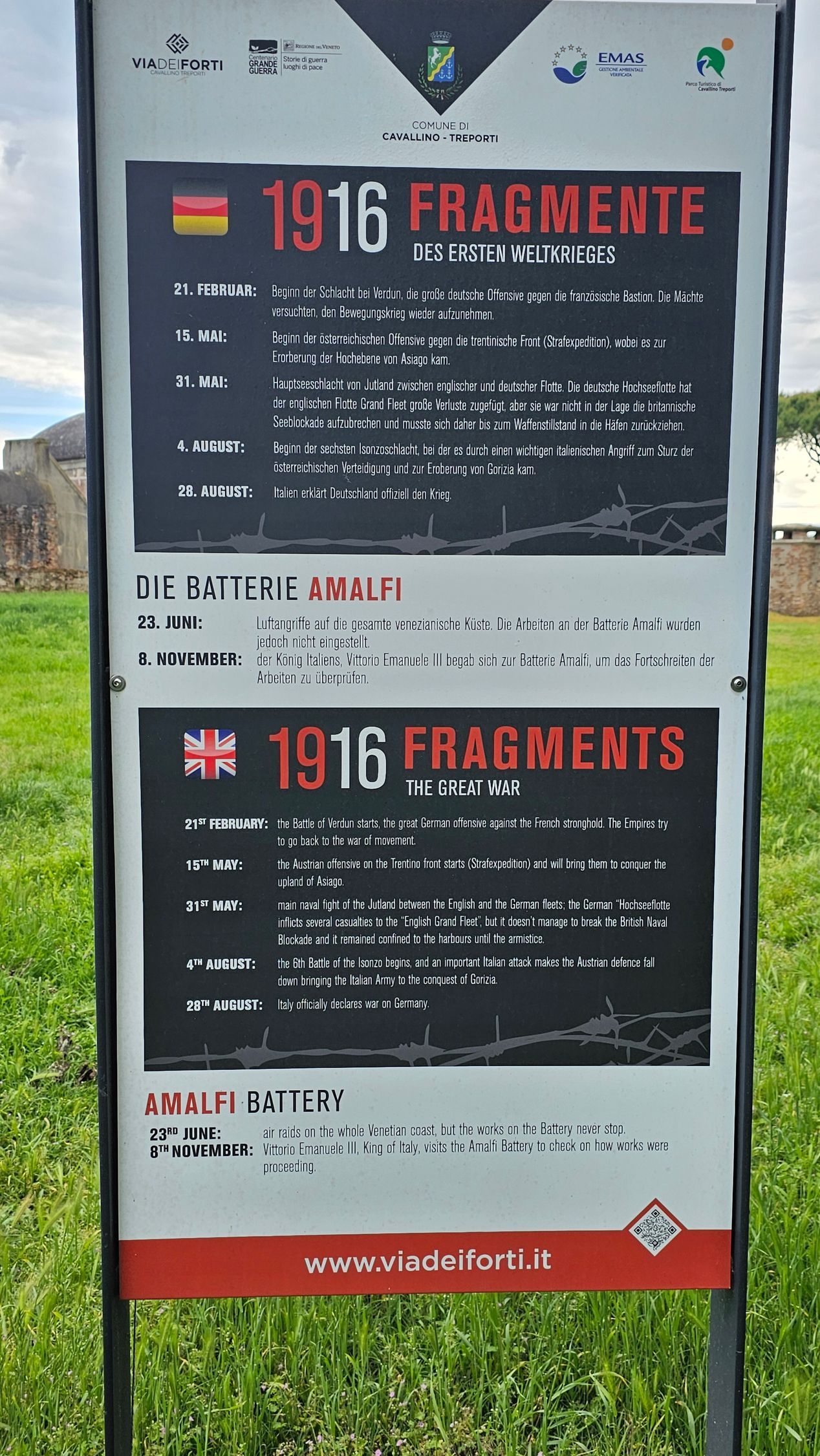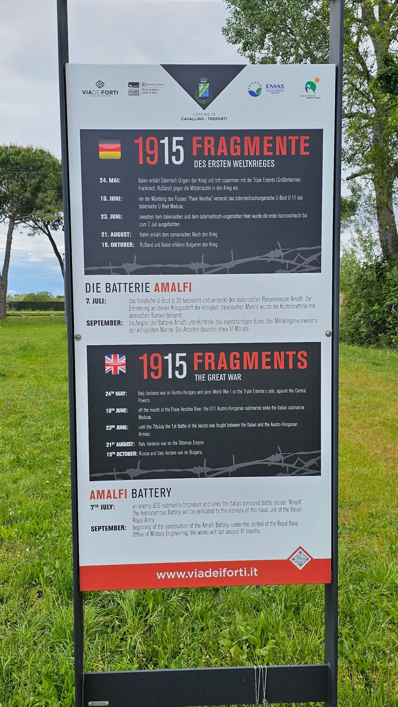 Im Inneren der Amalfi-Batterie befanden sich 14 Gebäude. Der damalige Stolz war der um 360° drehbare Panzerturm vom Typ Marine, der mit zwei Kanonen bewaffnet war, die riesige 875-Kilo-Granaten mit einer Geschwindigkeit von einem Schuss pro Minute auf eine Entfernung von fast 20 Kilometern abfeuern konnten. In der Batterie gab Wohnräume für die Truppen und Offiziere, Lüftungsräume, Lager für Ladungen und Munition, Waschhäuser und Latrinen. Es war eine Stadt in der Stadt, eine Art Parallelleben zu dem Leben draußen auf der Straße, inmitten der Ungewissheit der Zukunft und eines immer näher rückenden Gegners nach der Niederlage von Caporetto 1917.