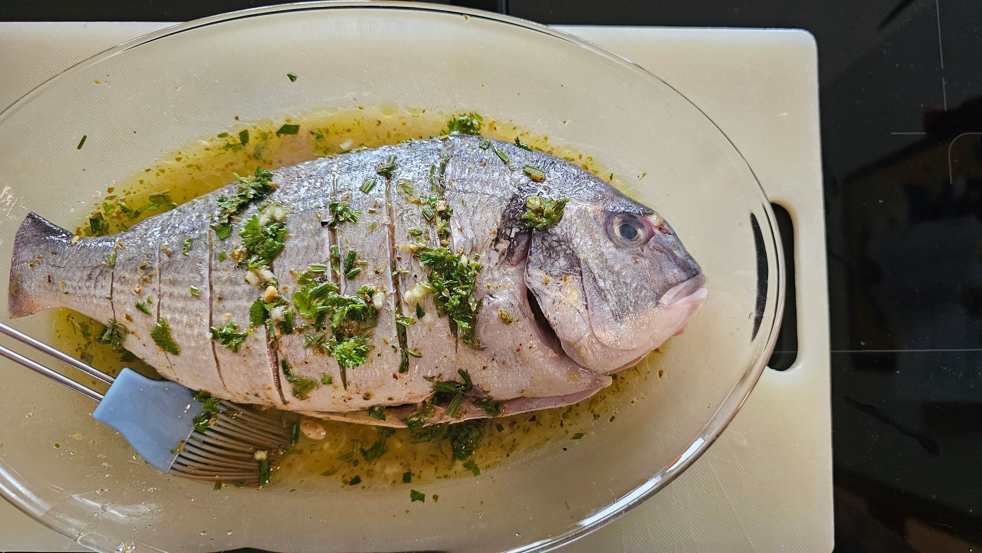 - Die Dorade an den Hautseiten leicht einschneiden, damit die Marinade besser einziehen kann