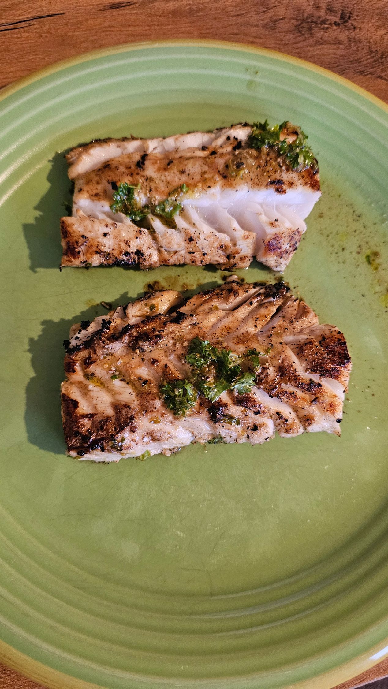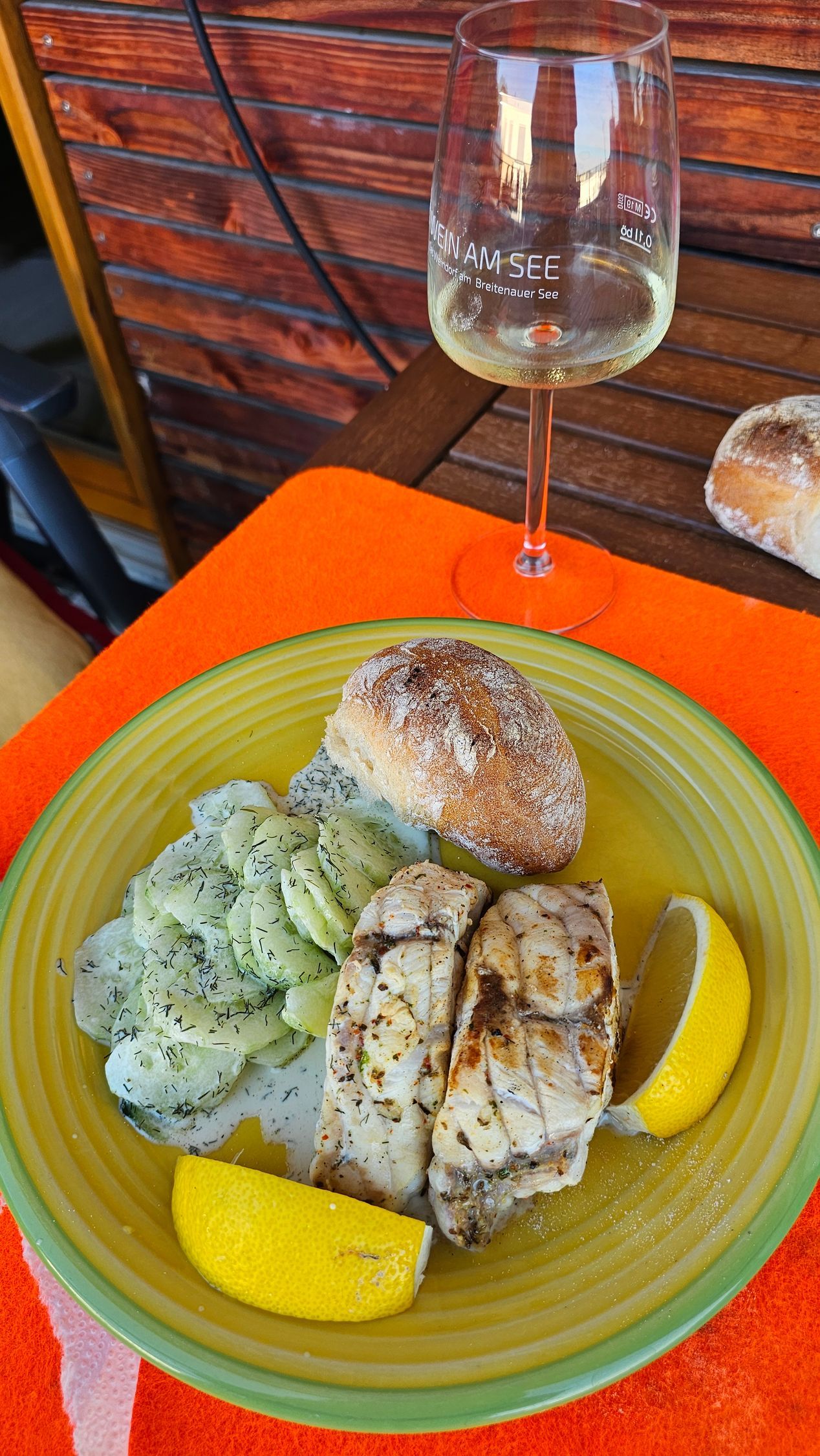 Wir haben den Fisch dann zum Schluss noch bei hoher Hitze "richtig" gegrillt, damit er etwas Röstaromen bekommt. - Zum Schluss noch mit Zitrone garnieren