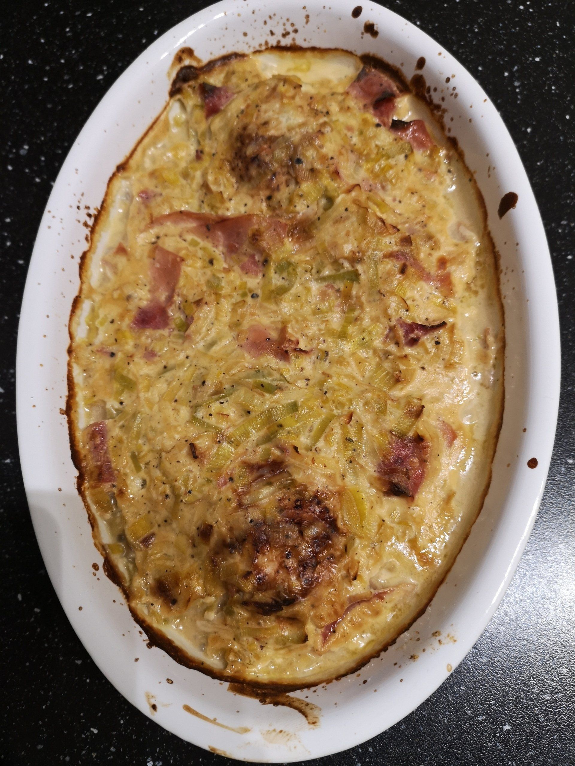 - Nun braucht der Flammkuchen noch 5 - 10 Minuten. Immer wieder schauen, weil der sehr schnell dunkel wird. Fertig!