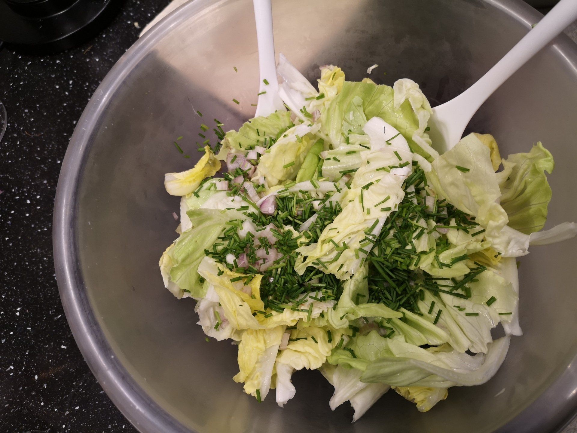 - Den Zitronensaft, die Gewürze (wir hatten noch etwas Pesto im Kühlschrank, was gut dazu gepasst hat), den gepressten Knoblauch und das Olivenöl in eine kleine Schüssel geben und gut vermischen