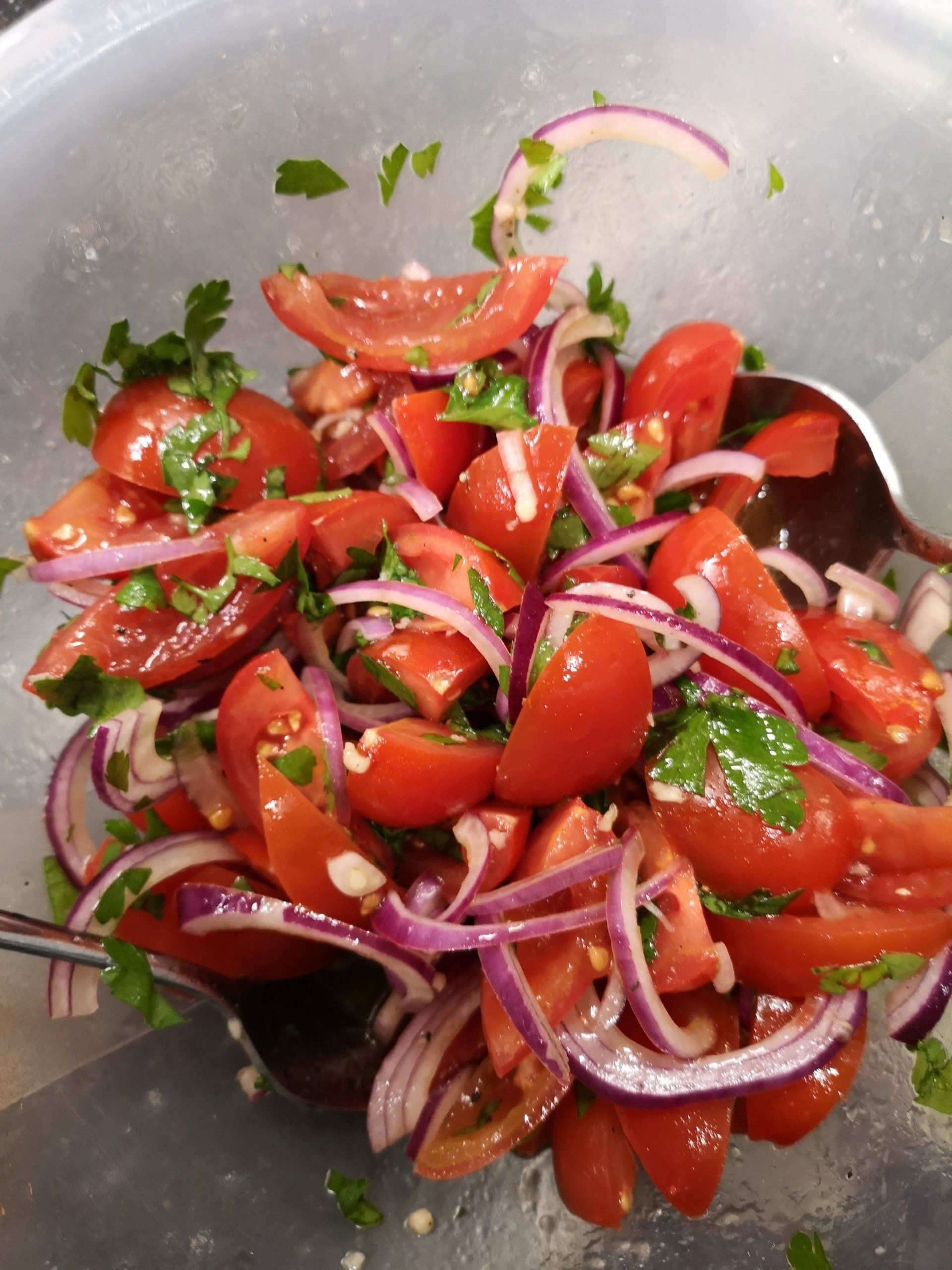 - Die marinierten Shrimps auf die Tomaten geben und die Marinade darübergiesen