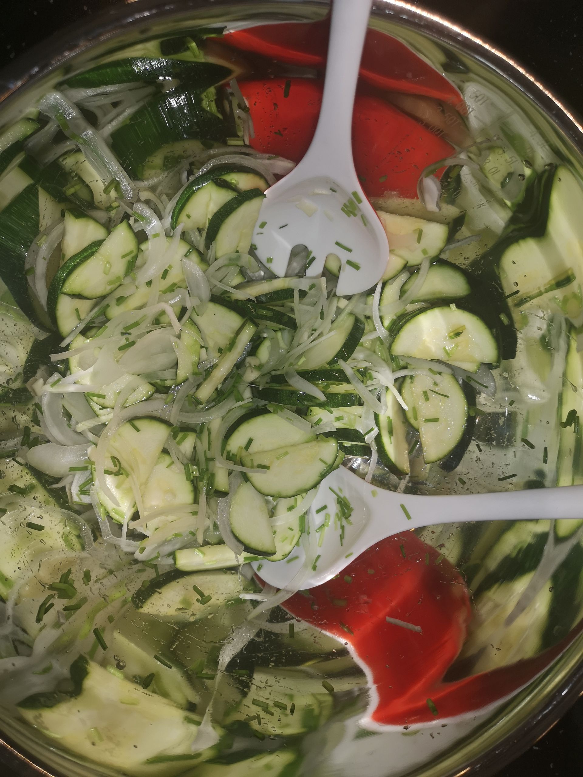 - Zucchini waschen, in dünne Scheiben schneiden und zu den Kartoffeln geben
