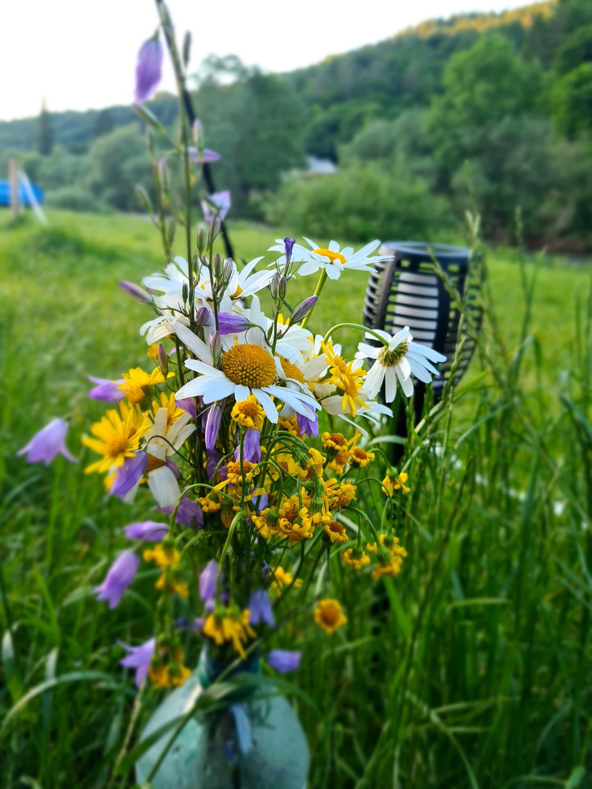 Dann gab es da noch eine kleine Wanderung zu einem Steinbruch auf der luxemburgischen Seite. Der "Steinbruch" wurde auf Google mit der Höchstnote bewertet. Na ja, das war ein Satz mit "X"... . Aber um einen ersten Eindruck über die Kleine Luxemburgische Schweiz zu bekommen war der Spaziergang gerade recht. Und ich konnte nicht widerstehen - ich musste ein paar Blumen pflücken. Und die Blumen haben dann tatsächlich fast die ganzen 2 Wochen gehalten.