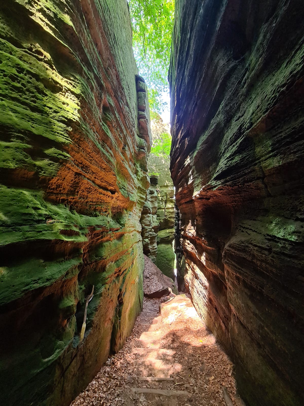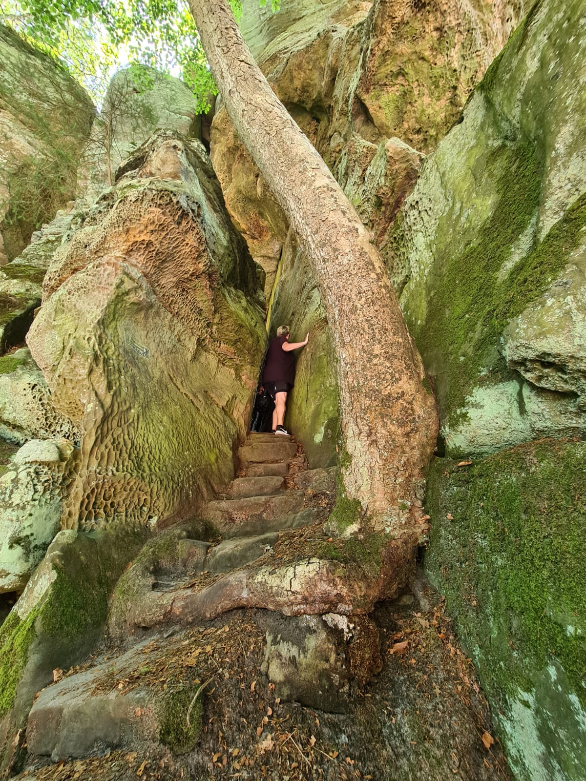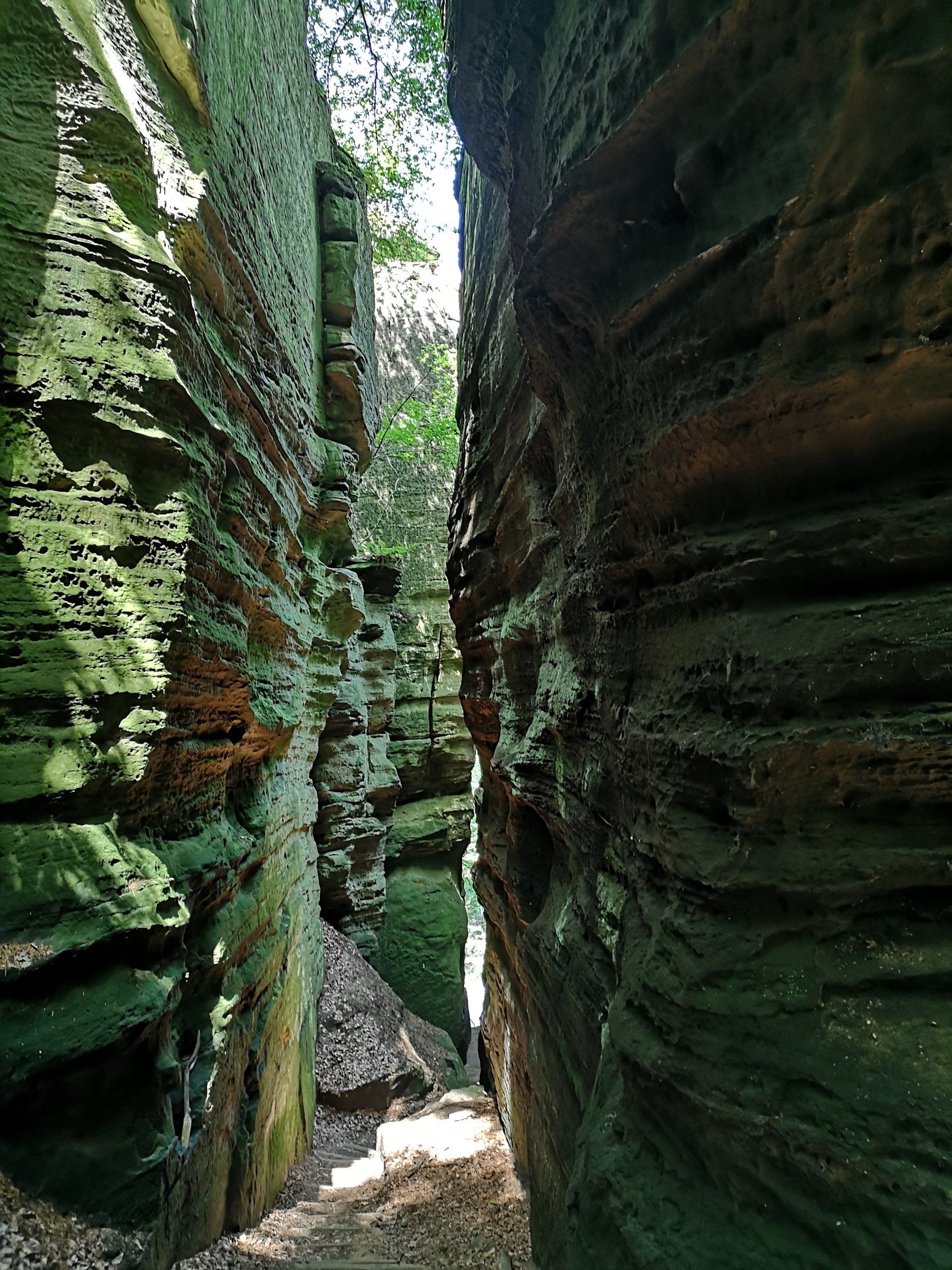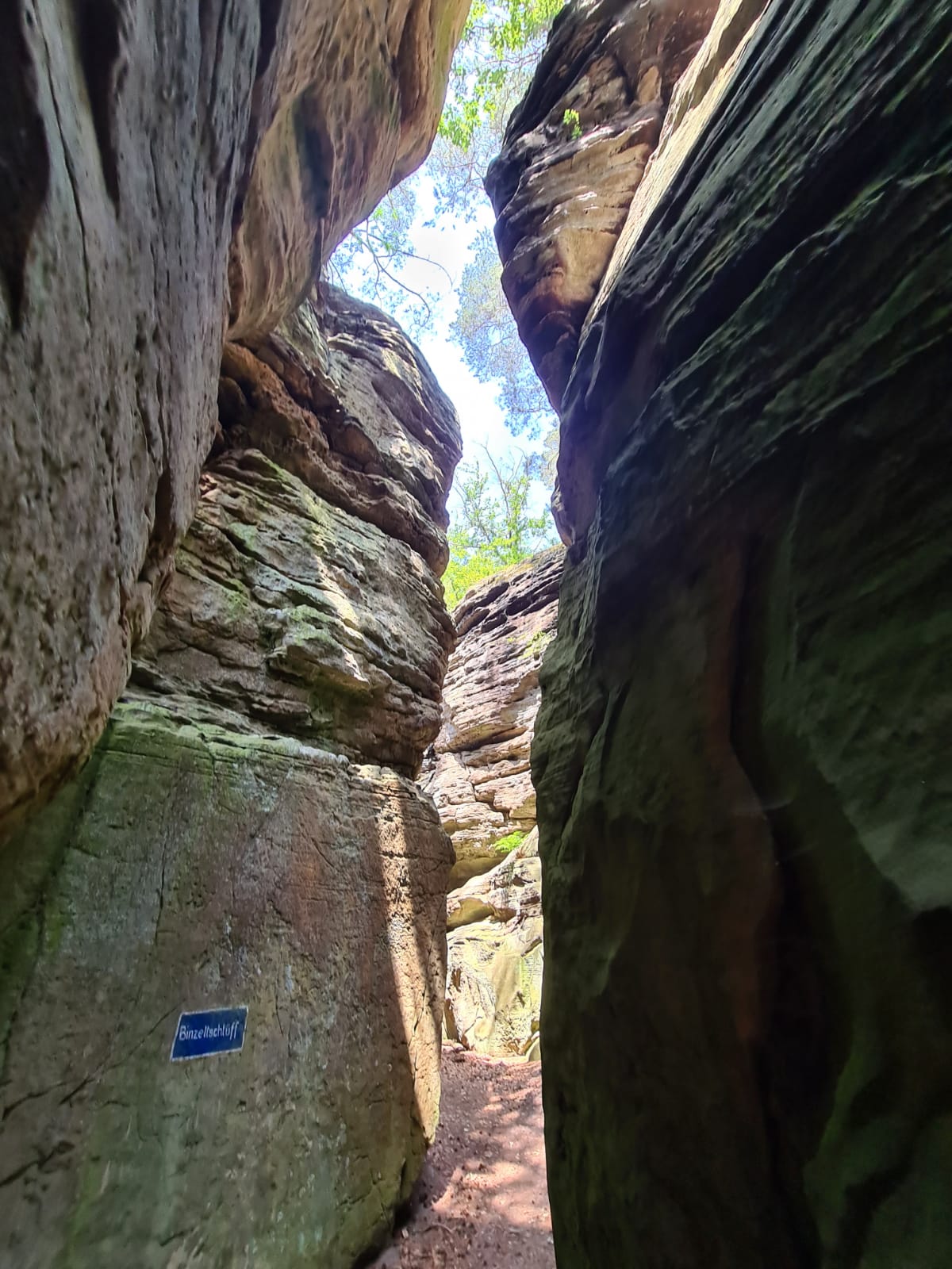 Und gleich daneben geht es dann in die "Werschrummschlüff". Erst geht es steil die Treppen hinauf, dann die Frage: "Wo geht es weiter". "Da im Sandstein ist eine tiefe Kerbe, da geht es rein." Die "Werschrummschlüff" ist eine tiefe Schlucht, durch die man sich im Gänsemarsch durchzwängen muss. Teilweise sind die Spalten gerade mal 30 cm breit. Es macht Spass sich durch dieses Labyrinth an Felsspalten durchzuschlängeln. Irgendwie erinnert uns das an die Slot Canyons aus den USA. Vor allem aber ist es hier schön kühl. "Draussen" hat es inzwischen gut und gerne 30 Grad. Da kommt so eine Abkühlung gerade richtig. Links und rechts ragen die Felsen hoch, scheinen in den Himmel zu wachsen. Und oben öffnet sich dann die Schlucht und man ist auf einer Art Lichtung zwischen Wald und Felsen.
