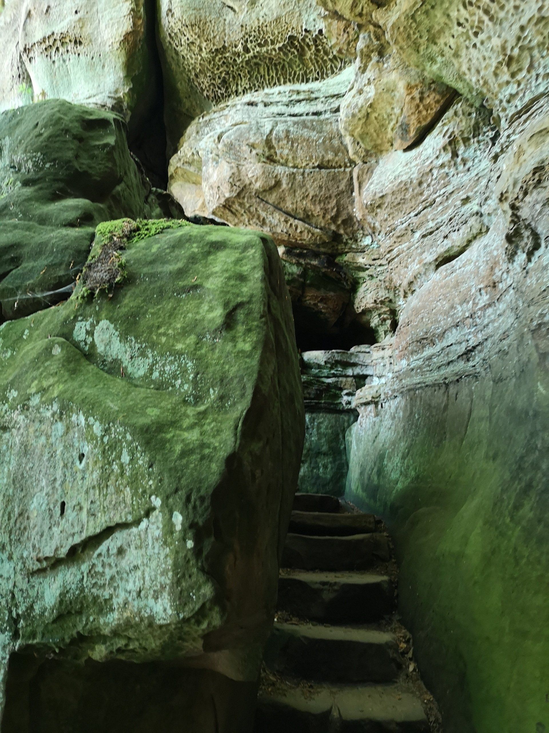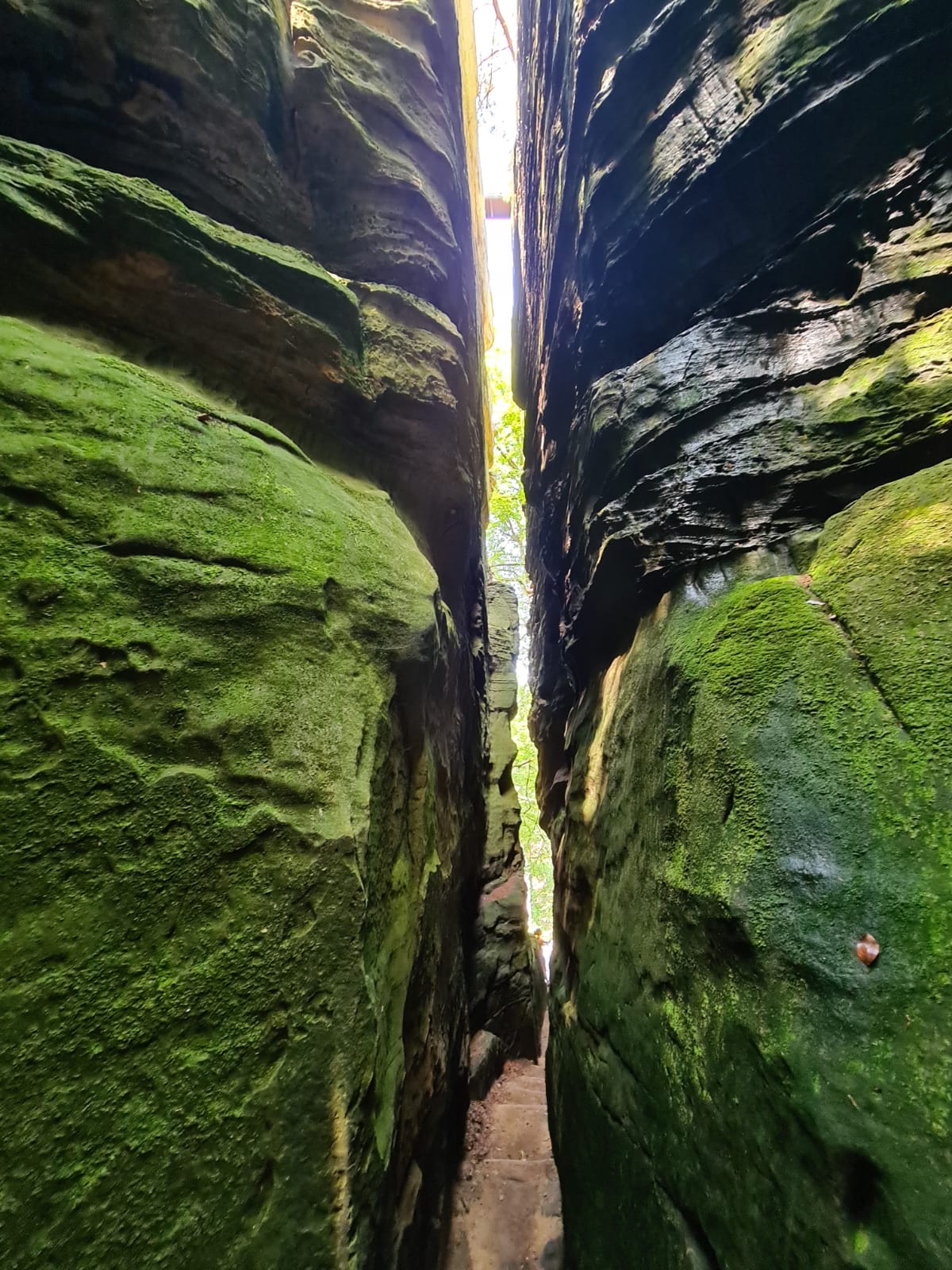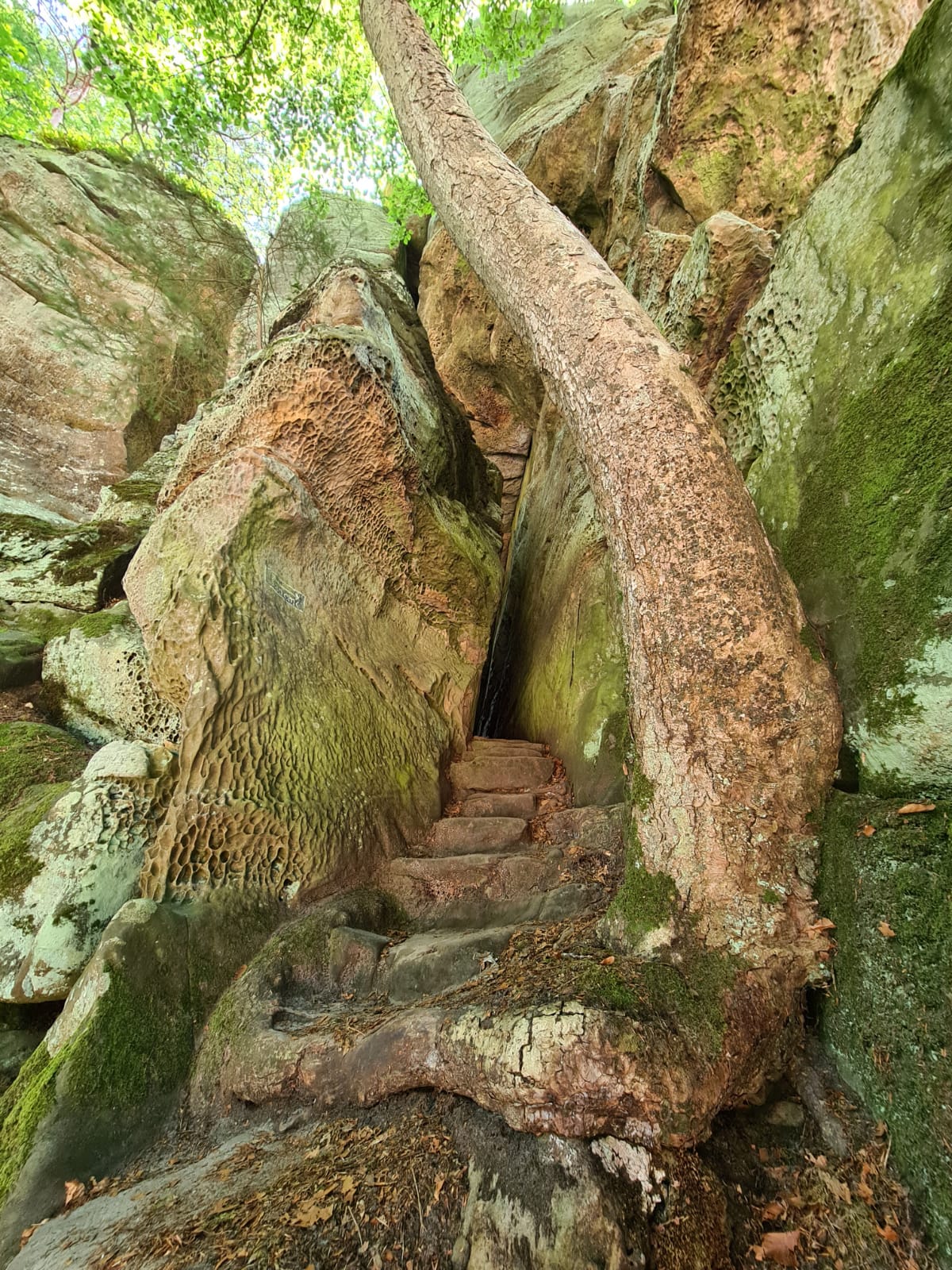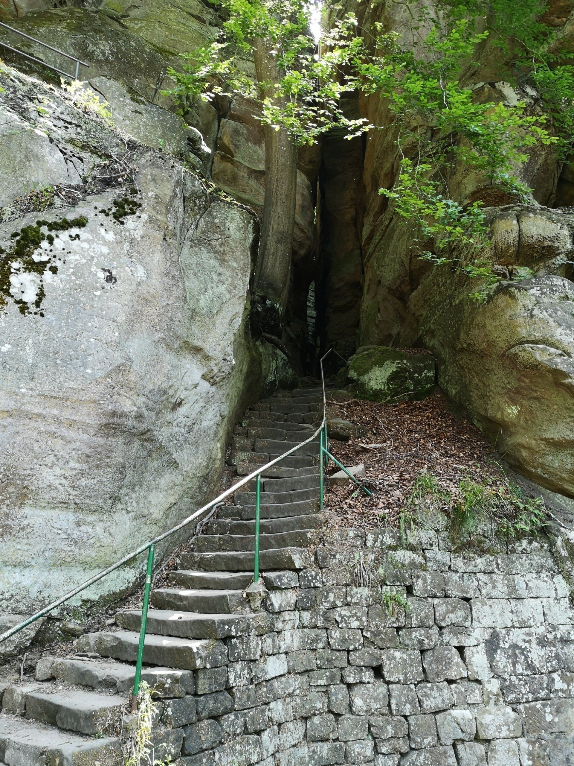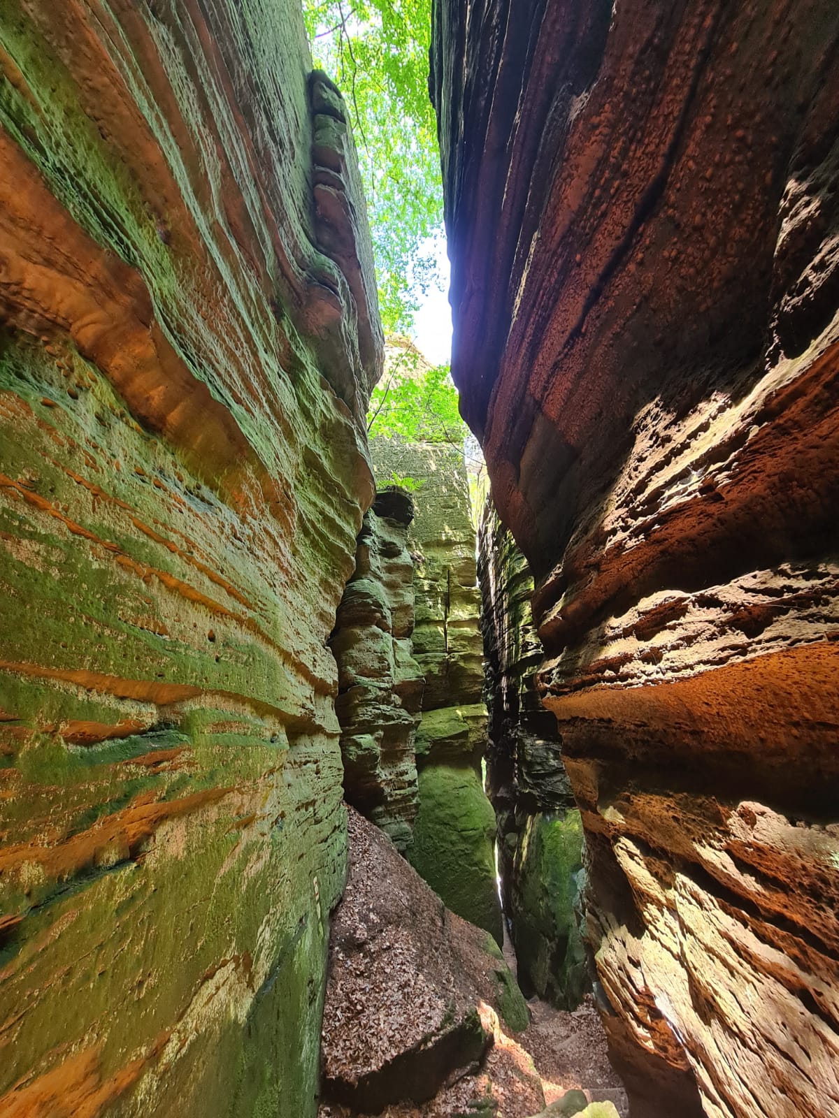 Und gleich daneben geht es dann in die "Werschrummschlüff". Erst geht es steil die Treppen hinauf, dann die Frage: "Wo geht es weiter". "Da im Sandstein ist eine tiefe Kerbe, da geht es rein." Die "Werschrummschlüff" ist eine tiefe Schlucht, durch die man sich im Gänsemarsch durchzwängen muss. Teilweise sind die Spalten gerade mal 30 cm breit. Es macht Spass sich durch dieses Labyrinth an Felsspalten durchzuschlängeln. Irgendwie erinnert uns das an die Slot Canyons aus den USA. Vor allem aber ist es hier schön kühl. "Draussen" hat es inzwischen gut und gerne 30 Grad. Da kommt so eine Abkühlung gerade richtig. Links und rechts ragen die Felsen hoch, scheinen in den Himmel zu wachsen. Und oben öffnet sich dann die Schlucht und man ist auf einer Art Lichtung zwischen Wald und Felsen.