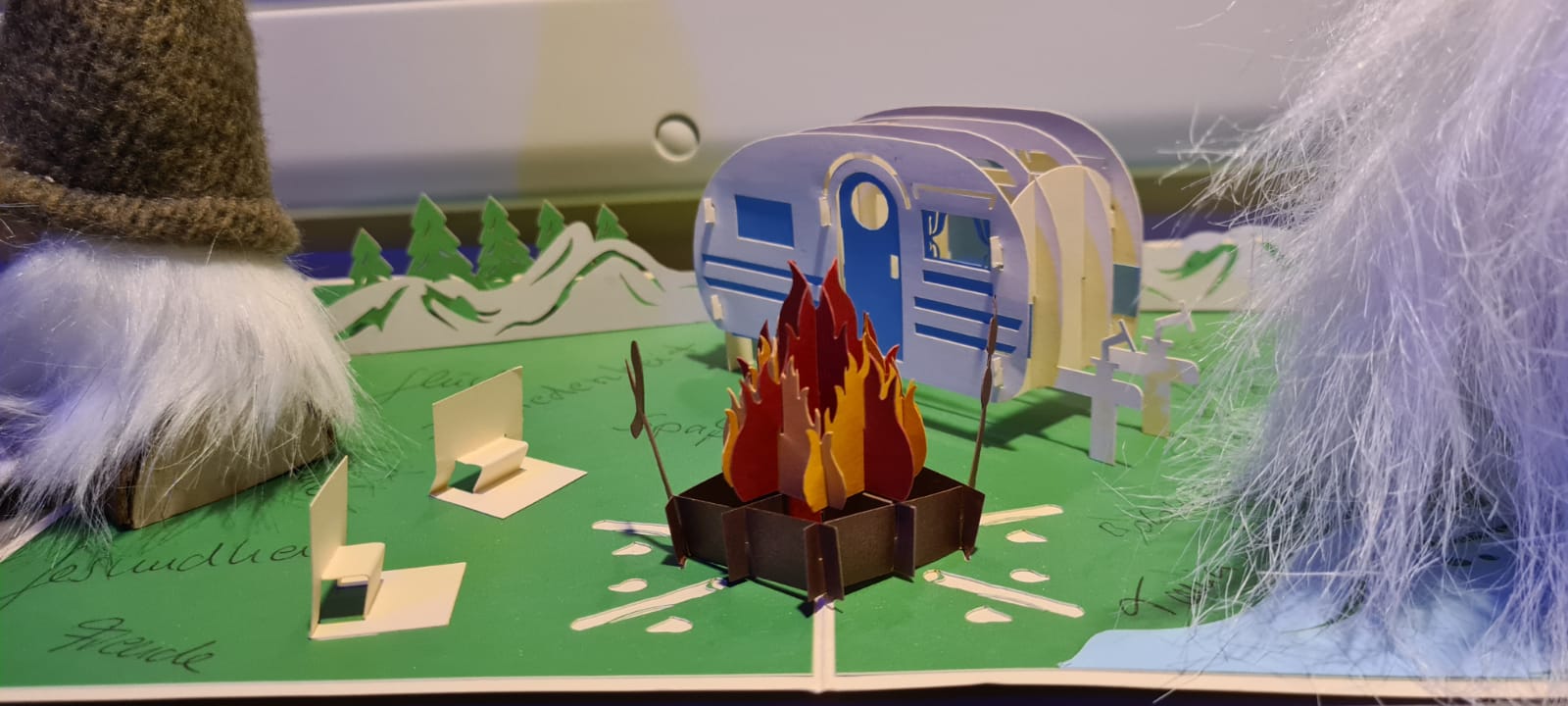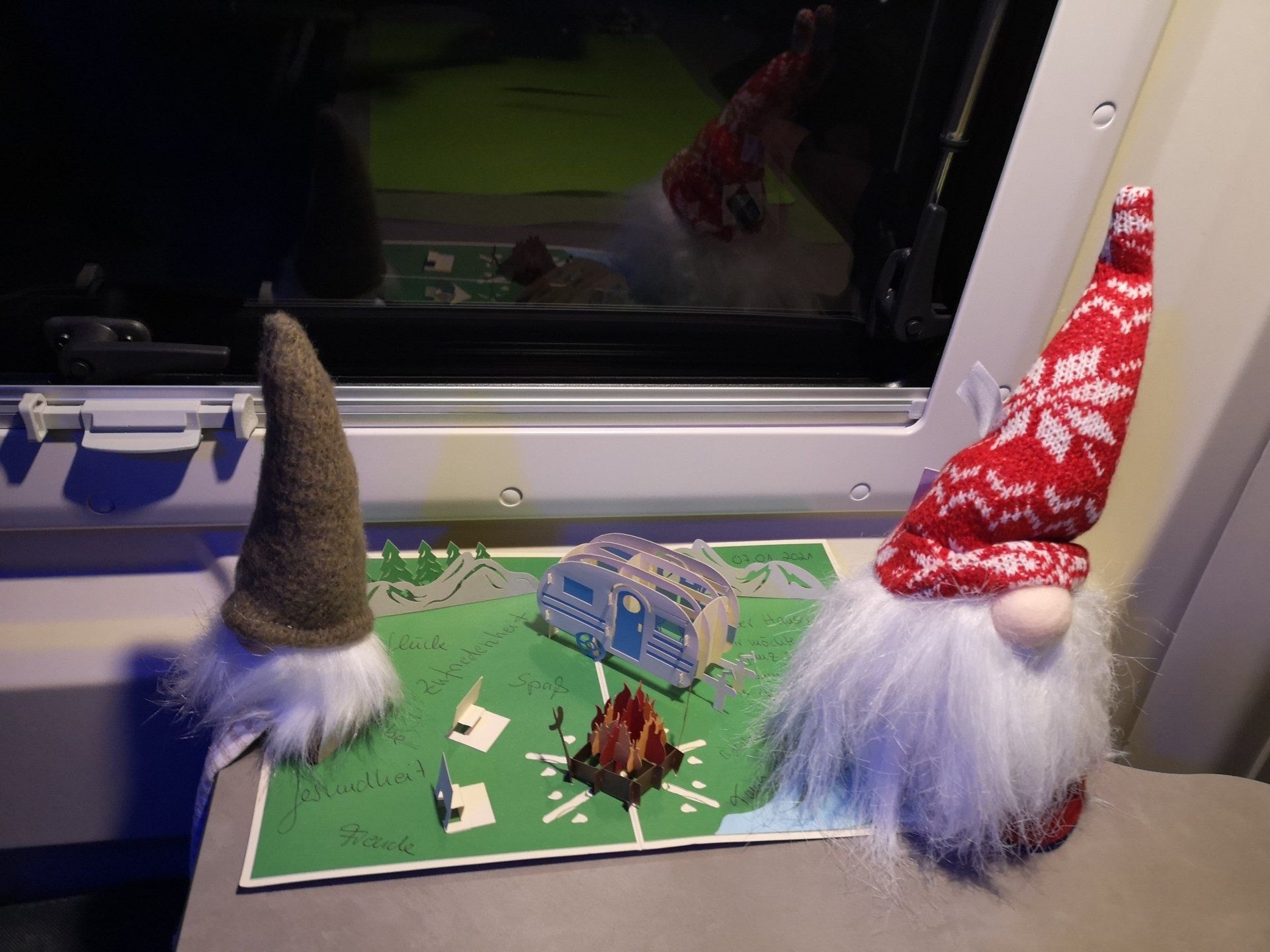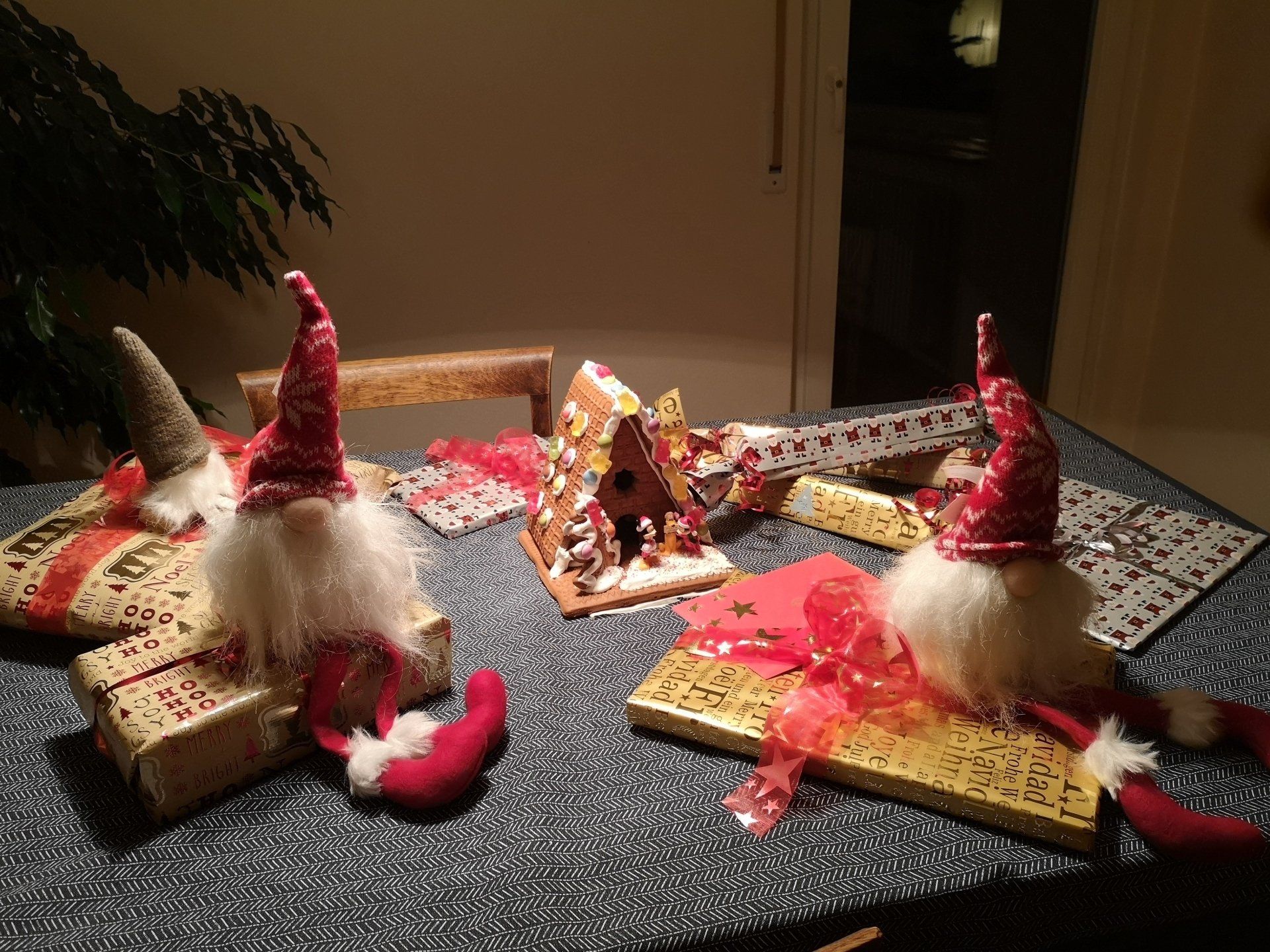 Dann war es Zeit, mit der Bescherung zu beginnen. Sieht der Geschenketisch nicht super aus? Jeder hat was bekommen, auch Hansi - zwei neue Salzstreuer für Amigo. Für Nina gab es Gummistiefelchen für den Camper, wenn es regnet und lustige Smiley-Socken. Tina hat eine "Die mit dem Hund geht"-Jacke bekommen, ein ganz persönliches Jahrbuch für 2020, Akkordeon Noten und noch viel mehr. Alle waren glücklich und zufrieden. Wir sassen dann noch bis spät in die Nacht zusammen und haben viel getrunken und gelacht. Natürlich sind wir über Nacht geblieben und nach einem leckeren Frühstück ging es dann wieder nach Hause.