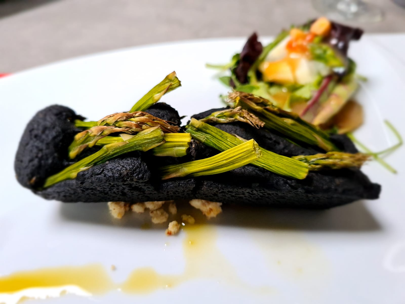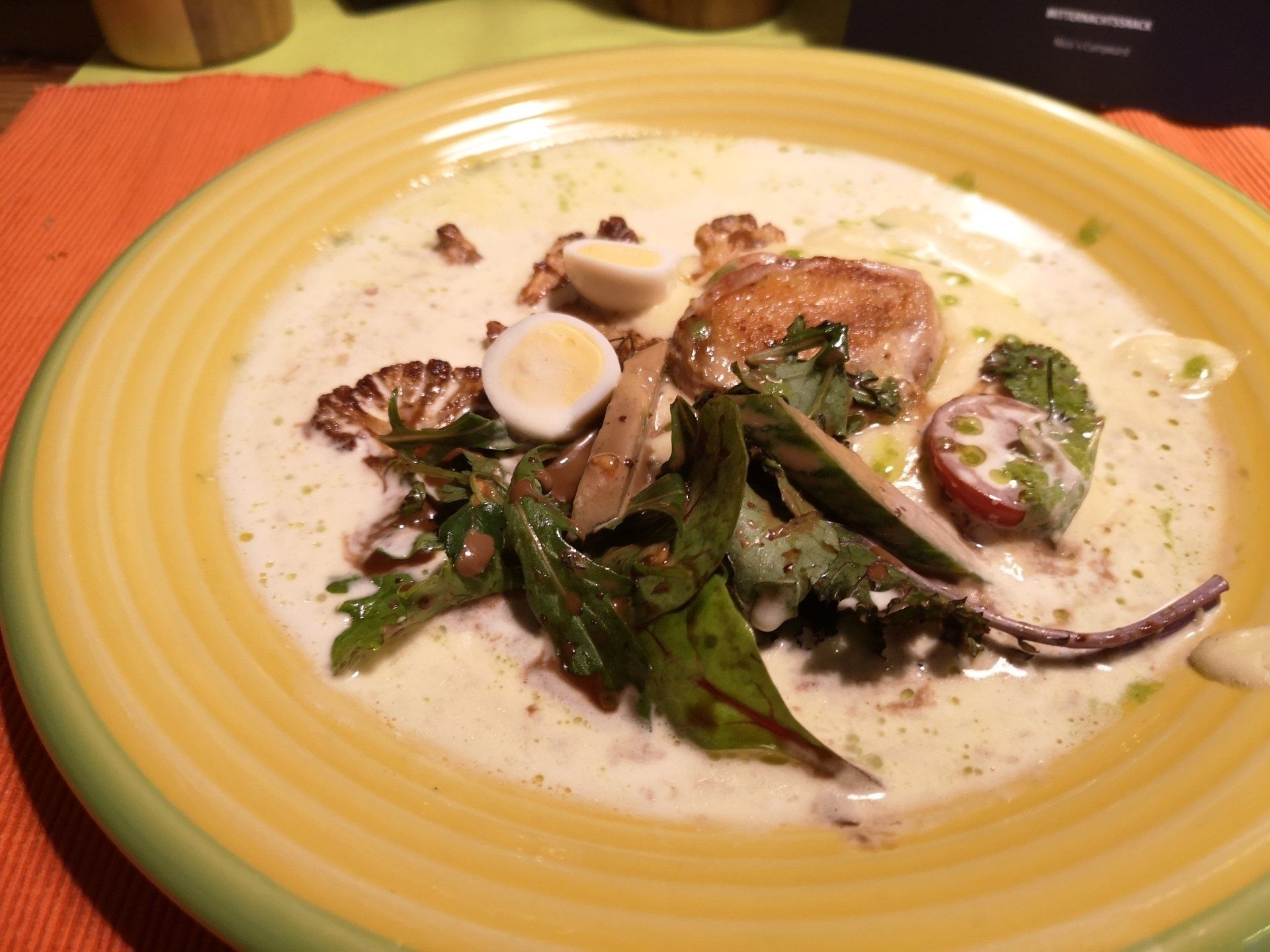Als Vorspeise haben wir die Spargelvariation genommen: "Thai Spargel / Spargelsorbet / Spargelsalat / fermentierter Knoblauch / Karamellisierter Ricotta". Das hört sich mal interessant an, sieht auch interessant aus, hält aber nicht, was es verspricht. Schade eigentlich.