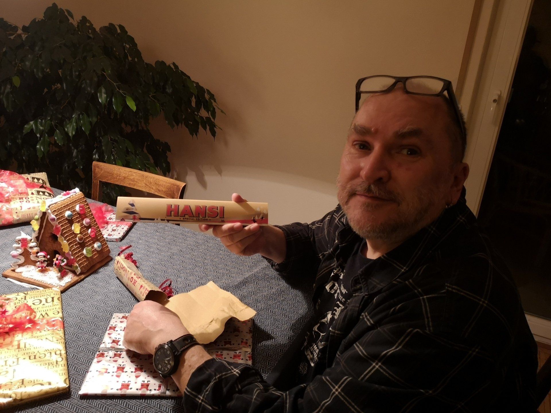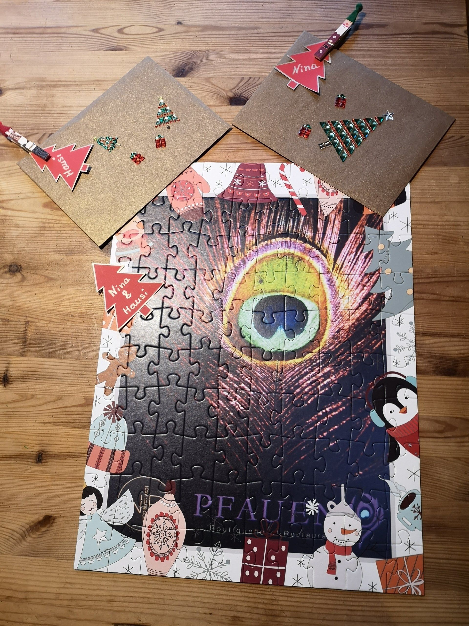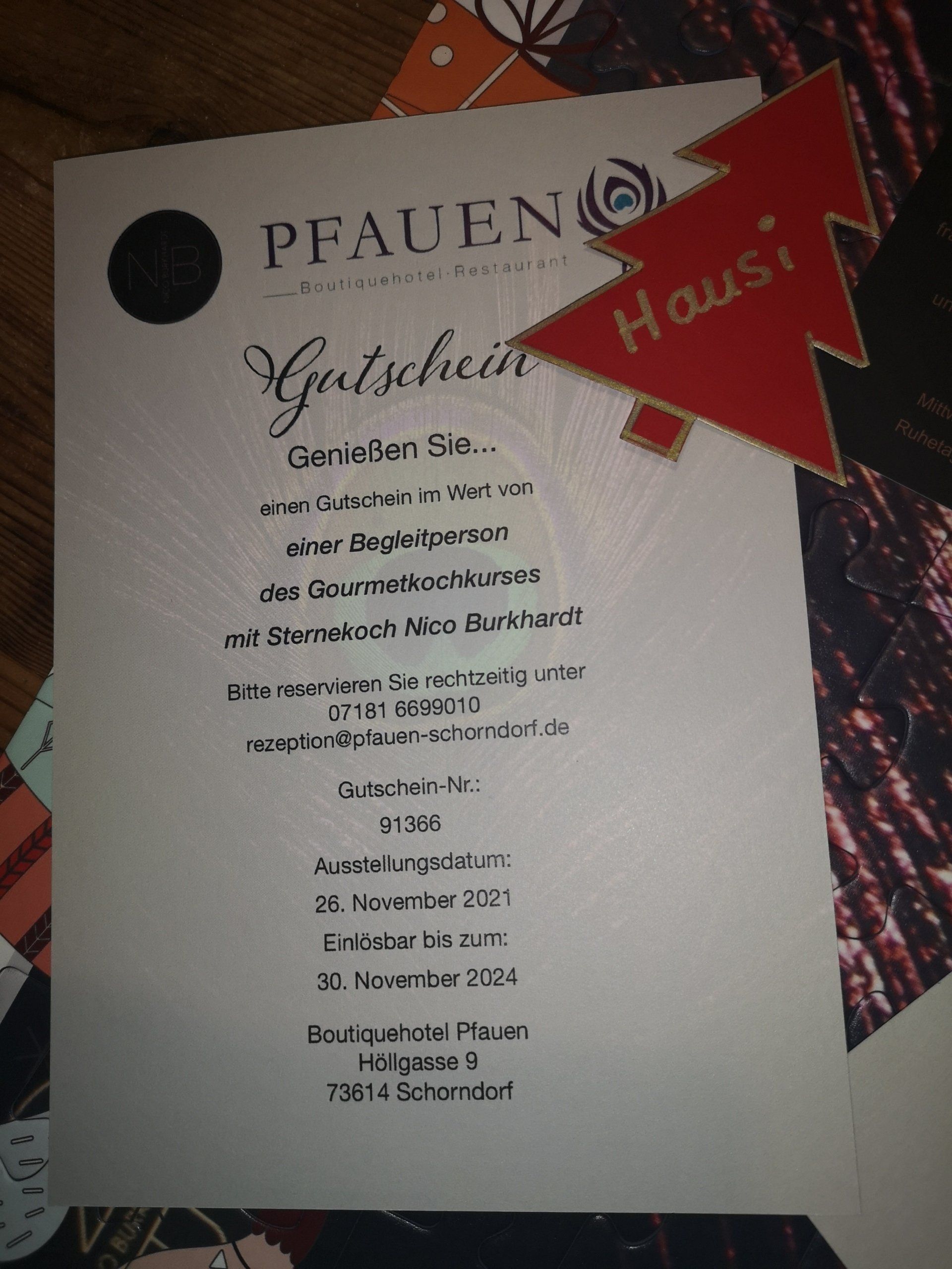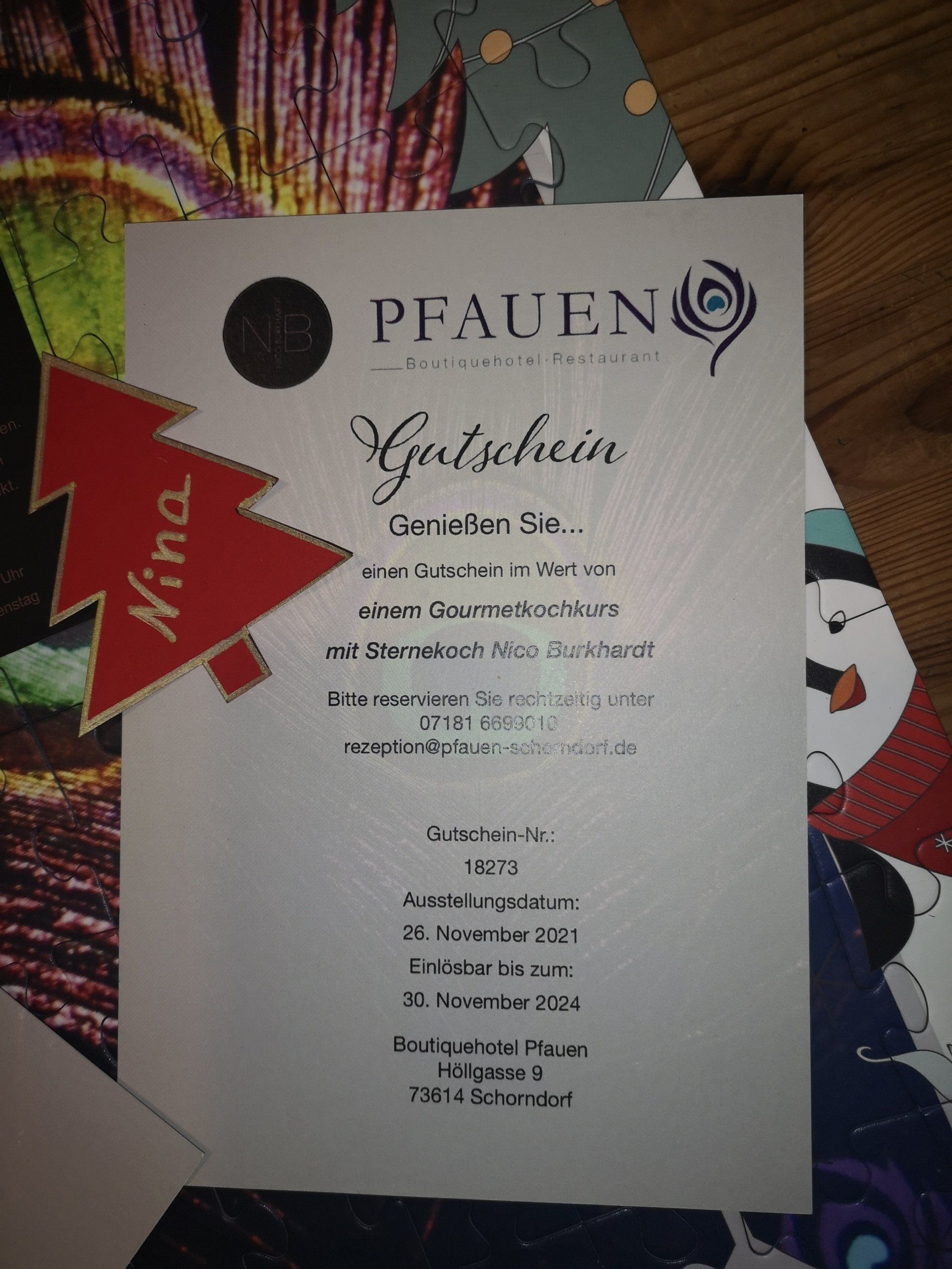 Und dann waren wir dran. Tinas Geschenke sind aber nicht nur Geschenke, sondern Inszenierungen. Hm, wir mussten erst einmal puzzeln und dann rätseln. Eine Pfauenfeder? Vielleicht etwas mit Wilhelma? Falsch! Pfauen? Hm, Restaurant Pfauen? Da haben wir doch letztes Jahr unsere Silvester Rocket Boxxxx geholt. Richtig!. Nun kamen also die Umschläge ins Spiel: Eine für Nina und einer für Hansi. Und wir konnten es kaum glauben: Ein Gutschein für einen Gourmet-Kochkurs bei Nico Burkhardt im Restaurant Pfauen. Der Hammer! Und dann Hansi: Er darf dann am Abend als Begleitperson am Essen teilnehmen - mit Weinbegleitung. Und wir mussten Tina versprechen, dass wir da reichlich trinken. Ihre Idee dazu: Ich fahre morgens mit der S-Bahn nach Schorndorf um am "Kochkurs" teilzunehmen. Hansi kommt dann am nachmittag mit Amigo nach - in nächster Nähe soll es einen Stellplatz geben - und dann können wir das Essen und den Wein geniessen. Oh, meine Schwester ist doch echt der Knüller. So schliesst sich nämlich unser Corona-Jahr 2021.