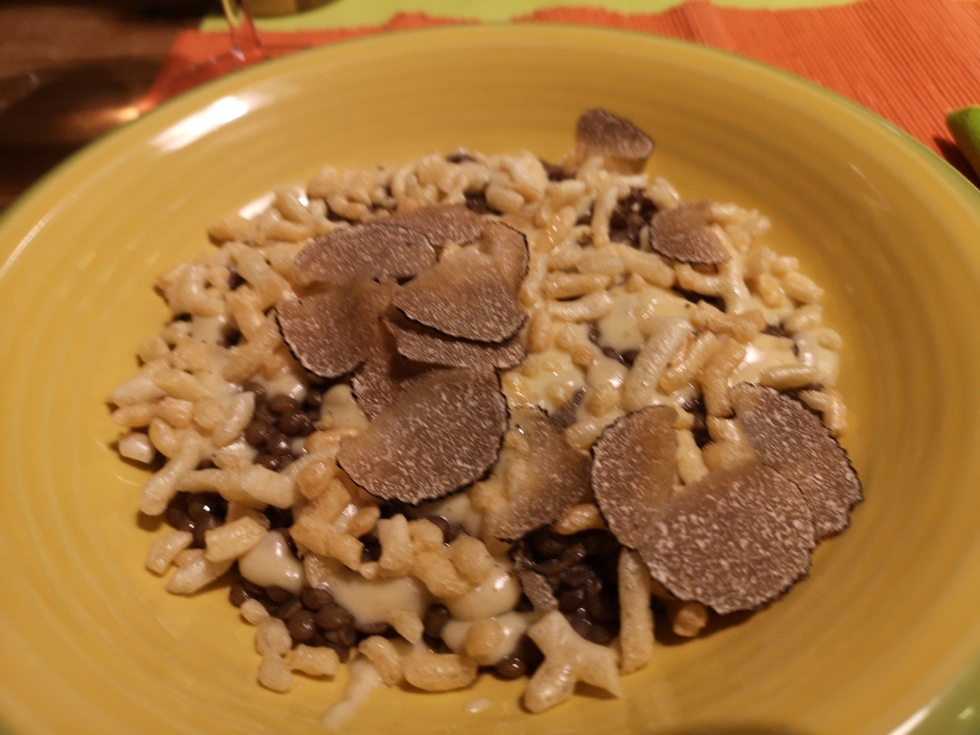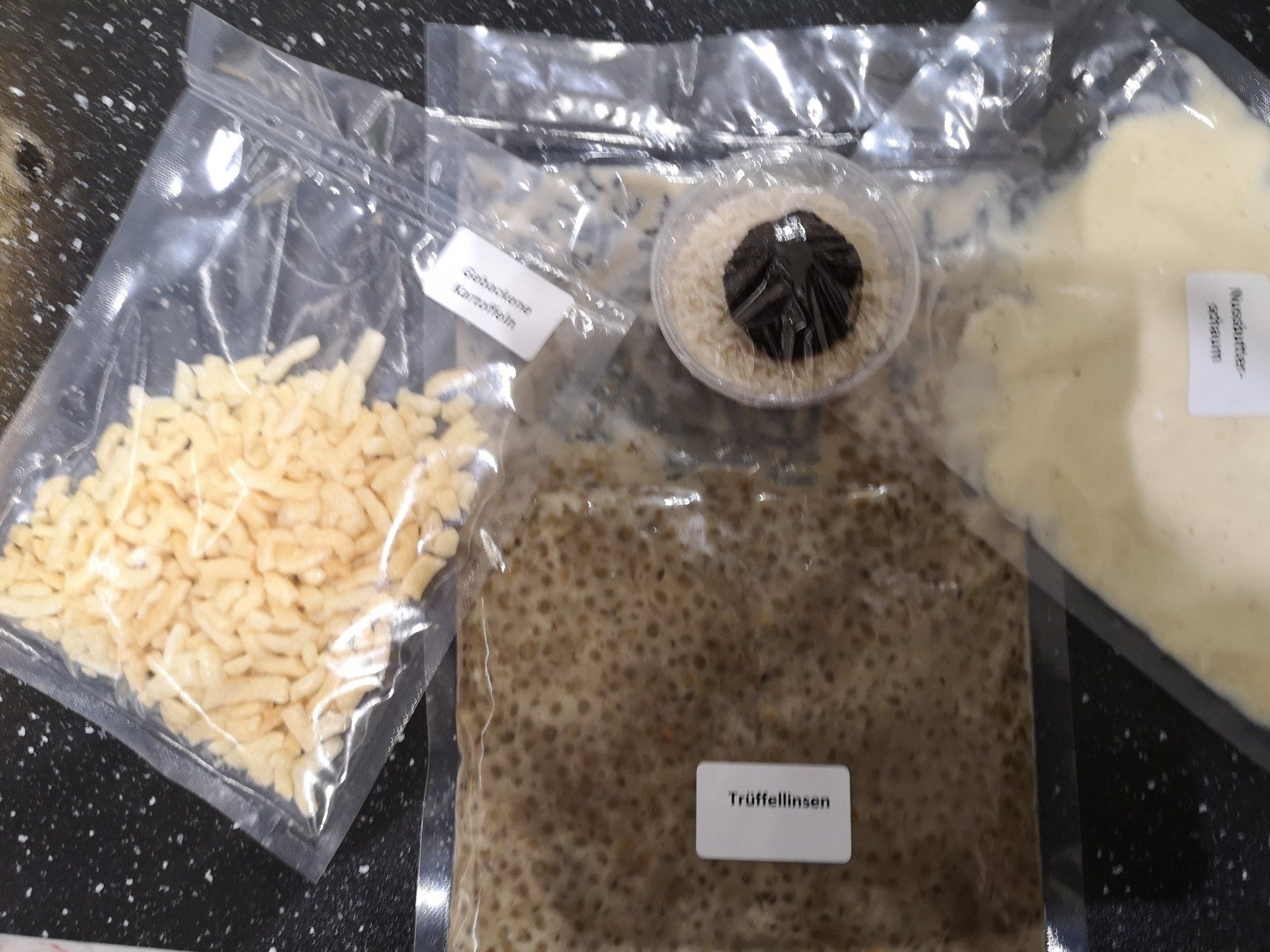 Nach einer kleinen Verschnaufpause ging es weiter mit den Trüffellinsen. Einfach alles im Wasserbad warmmachen und die Trüffeln darüberhobeln. Das war mal richtig lecker.