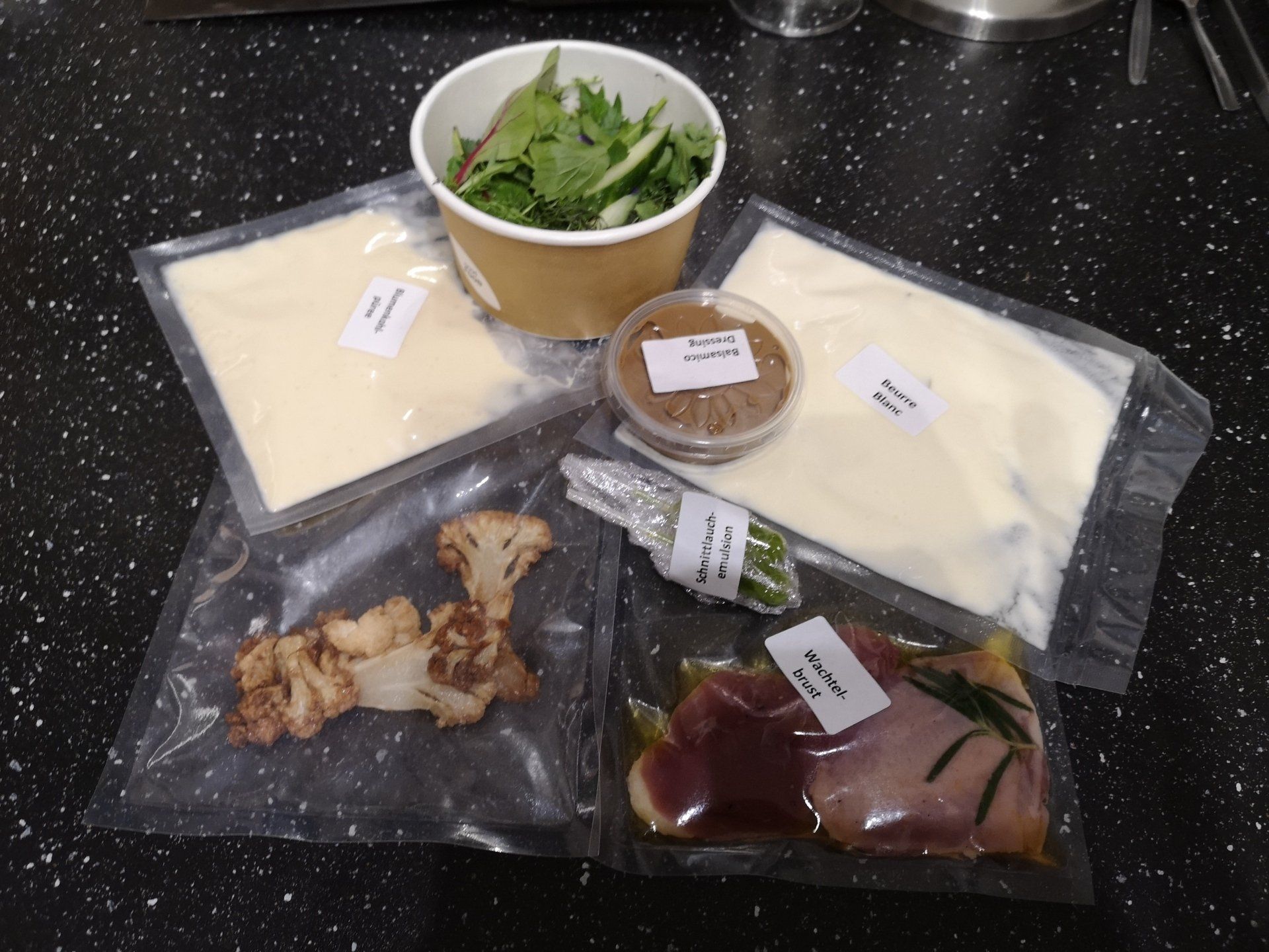Angeboten wurde ein 8-Gänge-Menü in einer Kochbox von Nico Burkhardt, der seit März 2020 mit seinem Gourmetrestaurant in Schorndorf mit einem Michelin Stern ausgezeichnet ist. Die Box wird dann an Silvester mittags von einem Busunternehmen geliefert. Alle Zutaten sind gut verpackt oder fast verzehrfertig eingeschweisst und es gibt eine ganz genaue Schritt-für-Schritt-Anleitung für jeden Gang. Das ganze war jetzt nicht wirklich ein Schnäppchen, aber es hat sich mega lecker angehört und das wäre genau das richtige für uns. Also gar nicht lange darüber nachgedacht und die Rocket Boxxx bestellt. Hätten wir die Box direkt im Restaurant und nicht über das Busunternehmen gebucht, hätten wir noch eine Flasche Champagner dazubekommen. Dann hätten wir aber selber noch nach Schorndorf fahren müssen. Dazu hatten wir aber keine Lust.