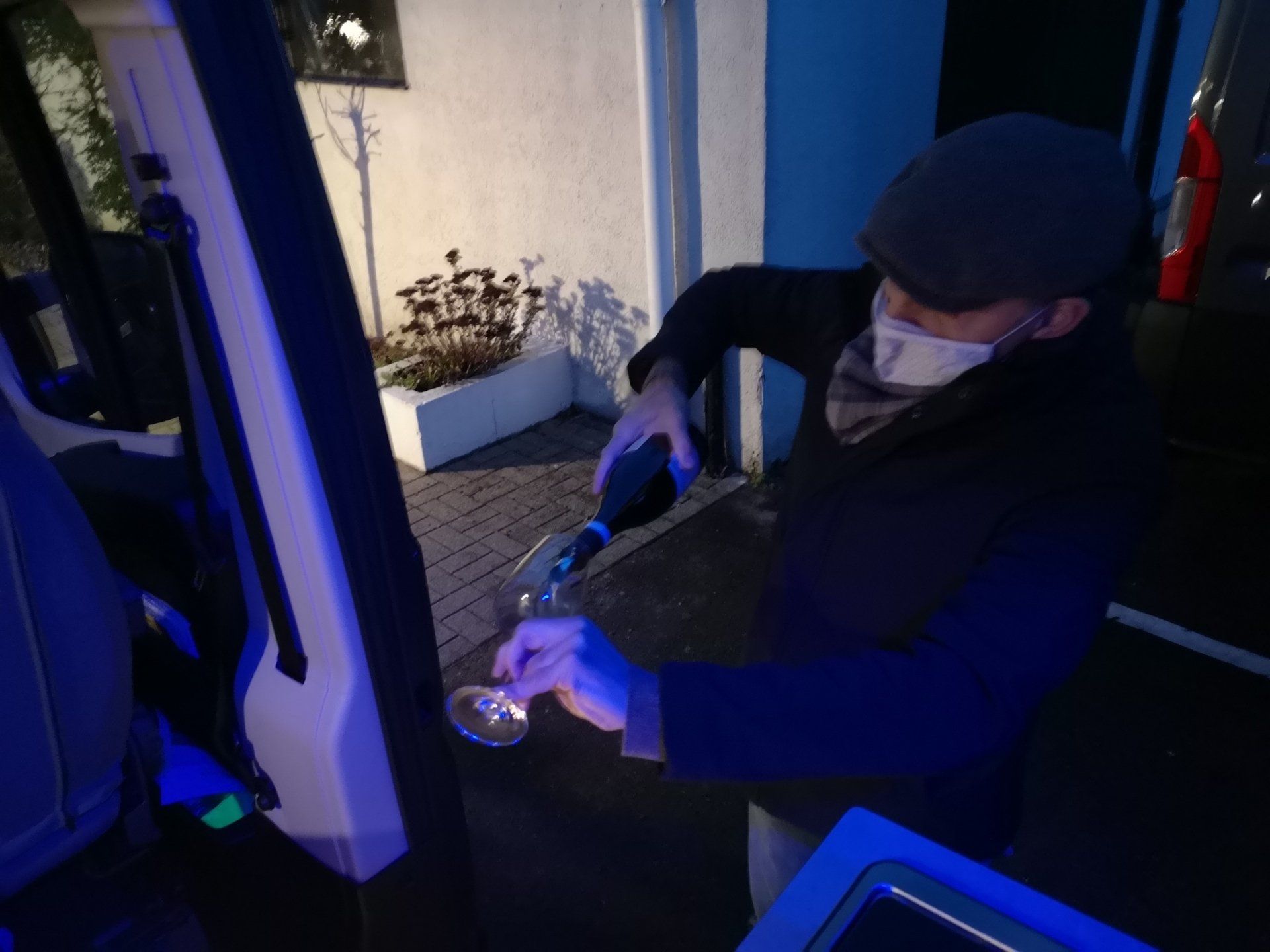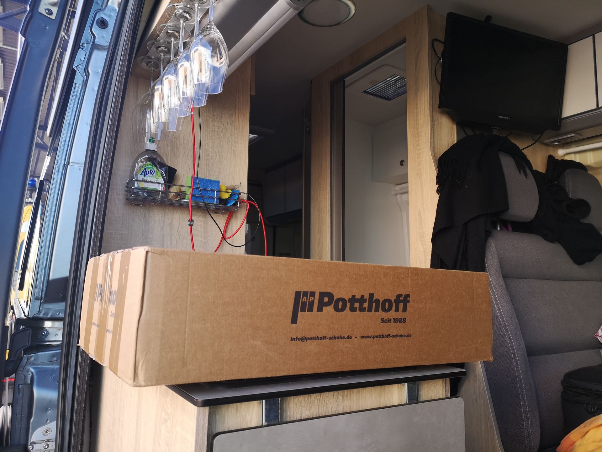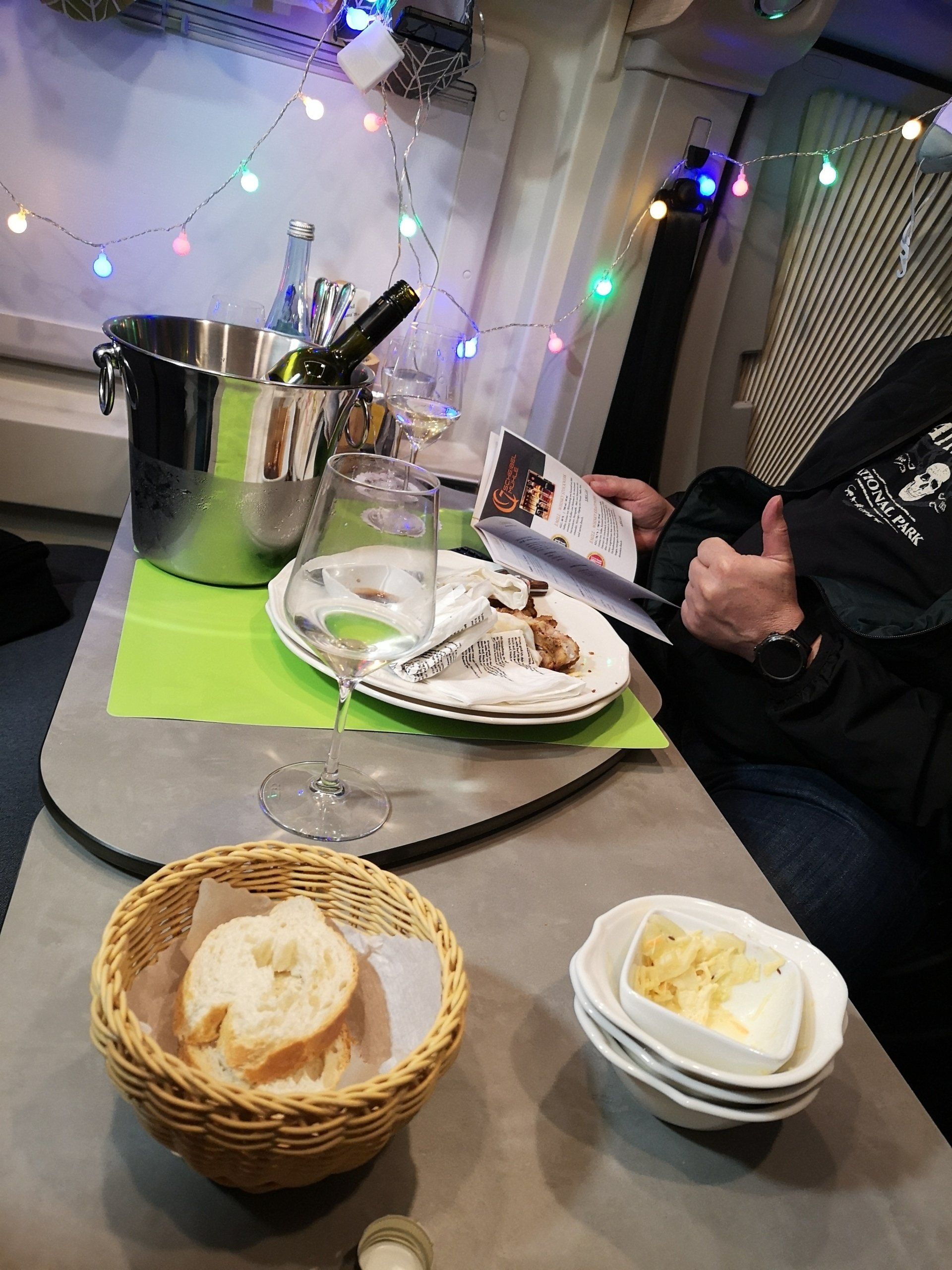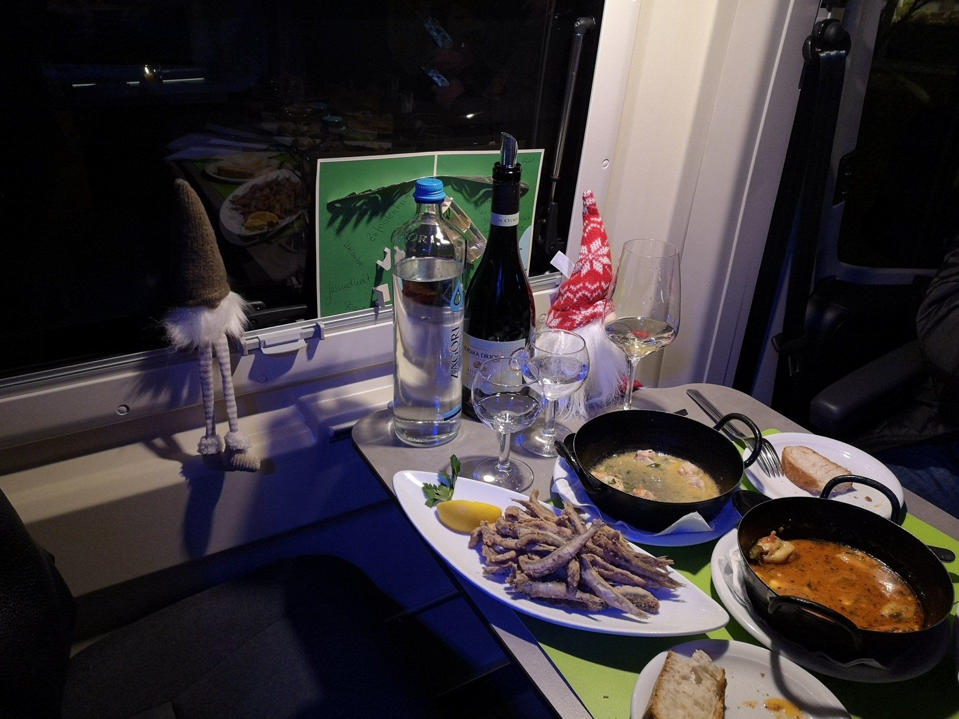 Wir haben den Camper schon während der Fahrt vorgeheizt, so dass es schön warm war im Innern und wir es uns gleich gemütlich machen konnten. Irgendwann war Zeit für die Vorspeise - also schnell mal unsere "Bestellhotline" angerufen und bestellt und auch noch den leckeren Weisswein vom letzten Mal dazu.