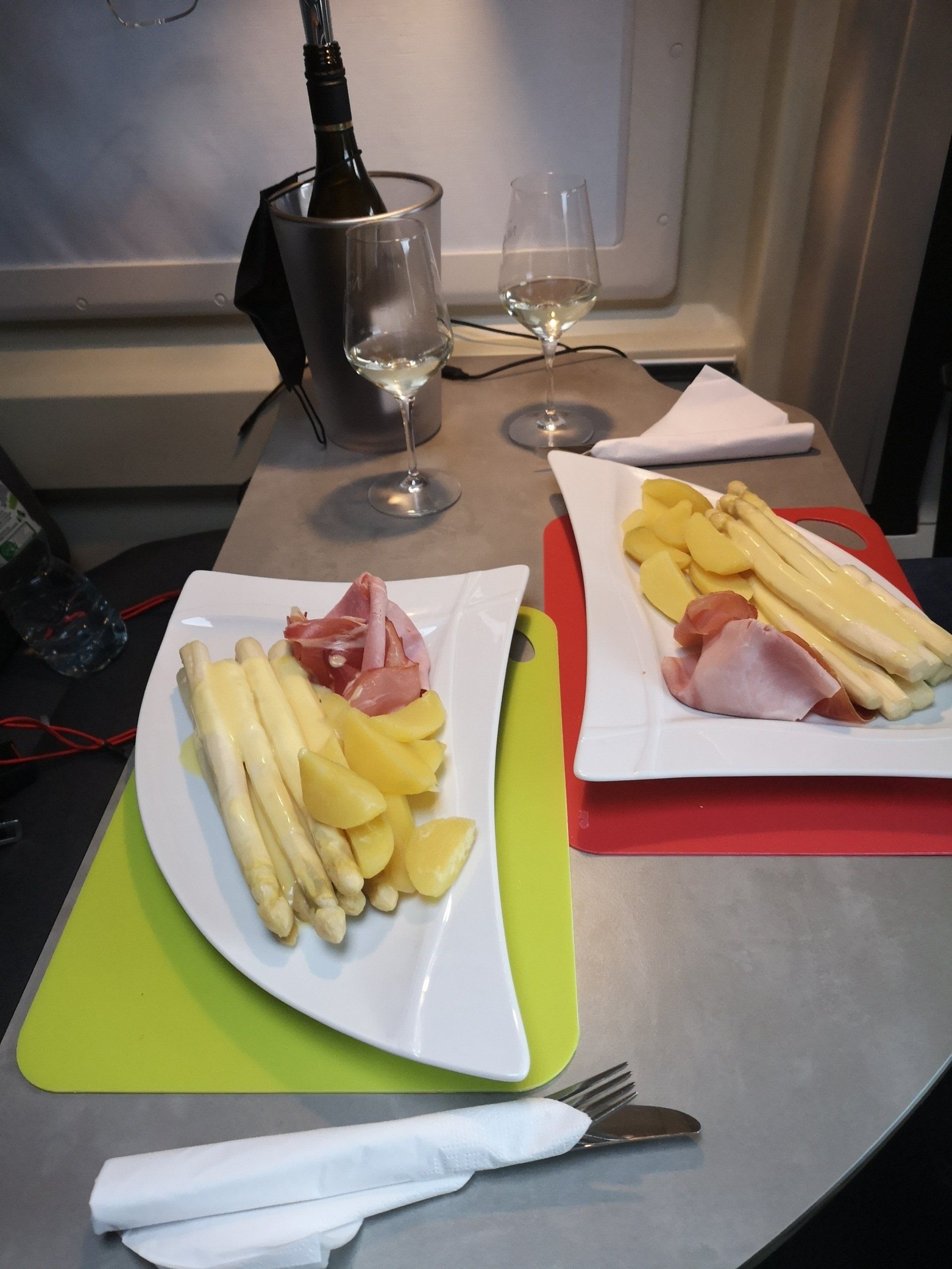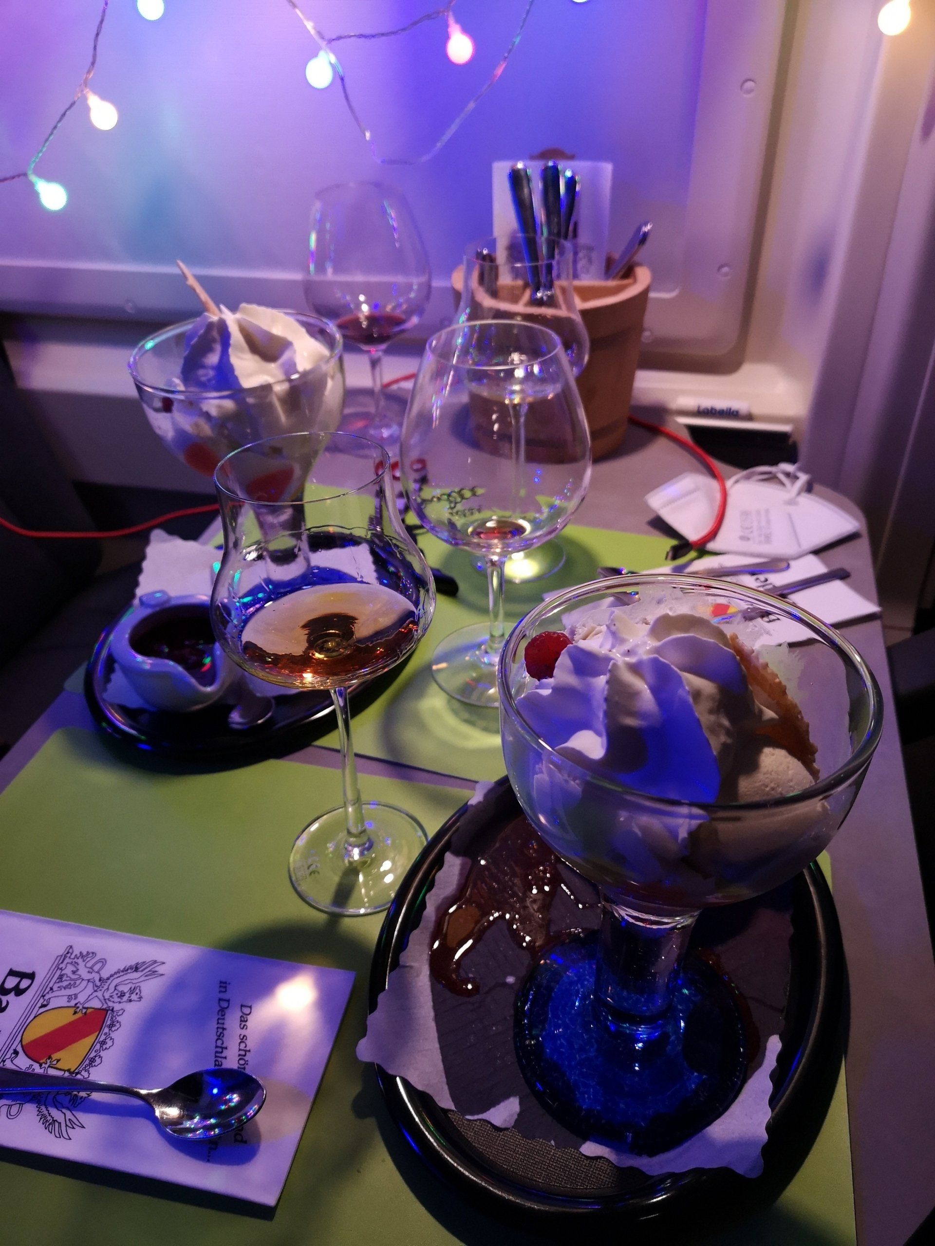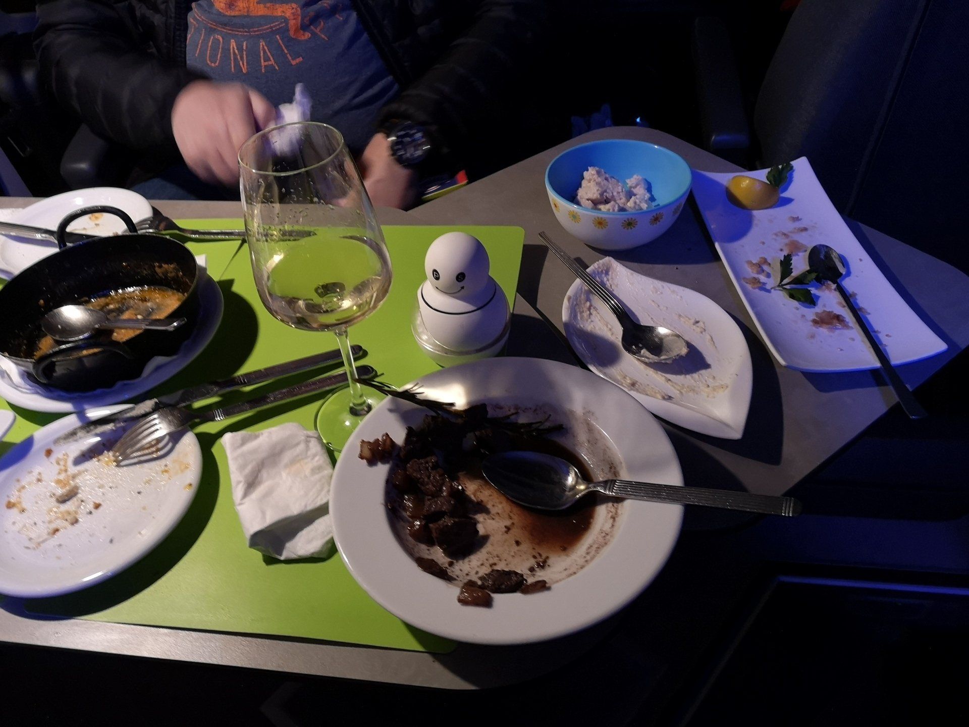 Man kann entweder das Menü bestellen oder à la carte oder auch zwischen Menü und Karte hin und her springen. Auch die Weinkarte kann sich sehen lassen. Wir haben also bestellt und wenn wir einen Wunsch hatten oder der nächste Gang gebracht werden konnte, dann hat man einfach die Servicenummer angerufen. Alle Servicemitarbeiter waren super freundlich und hochmotiviert. Und auch die "Schnapskarte" hat keinen Wunsch offengelassen. Man konnte ja schliesslich über Nacht stehen bleiben. Ach ja: Auch wer autark unterwegs ist: Die Toiletten durften genutzt werden.