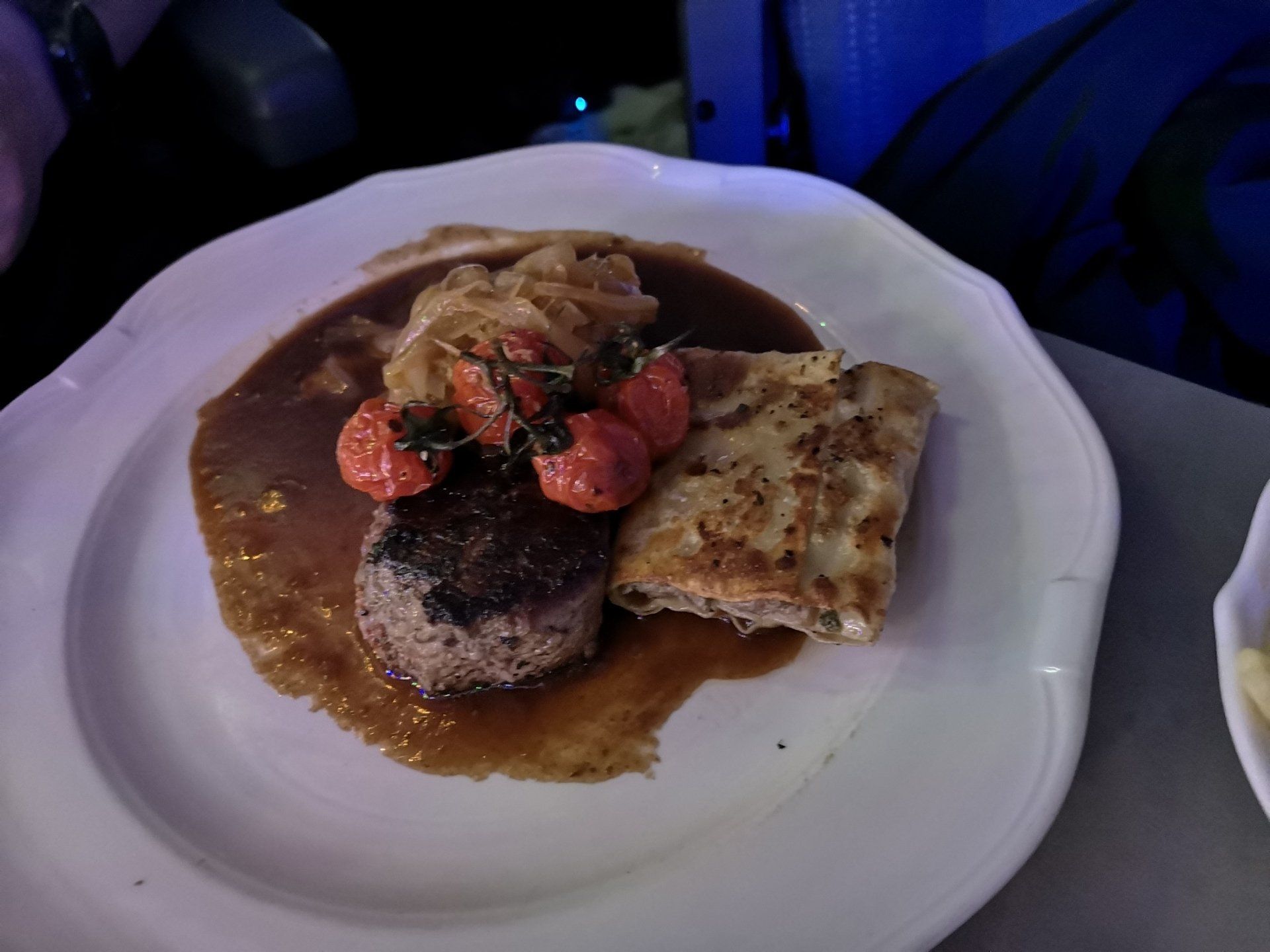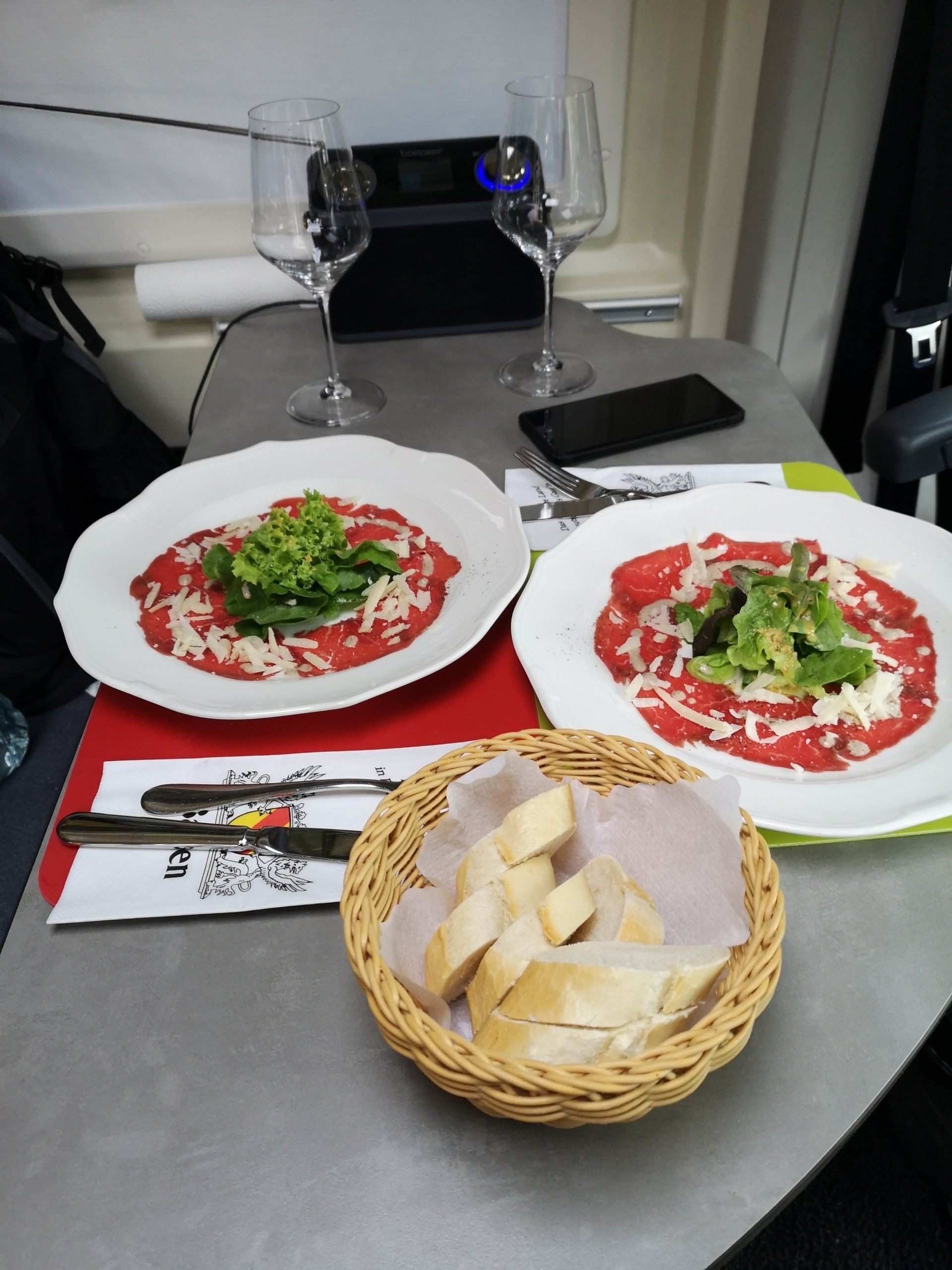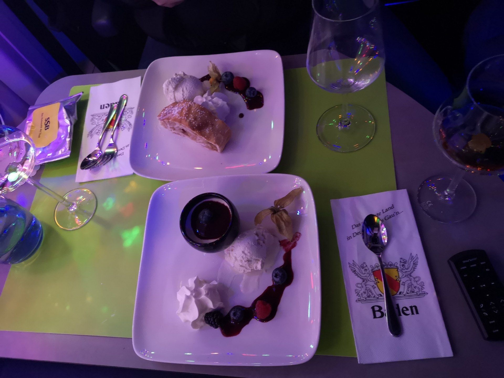 Man kann entweder das Menü bestellen oder à la carte oder auch zwischen Menü und Karte hin und her springen. Auch die Weinkarte kann sich sehen lassen. Wir haben also bestellt und wenn wir einen Wunsch hatten oder der nächste Gang gebracht werden konnte, dann hat man einfach die Servicenummer angerufen. Alle Servicemitarbeiter waren super freundlich und hochmotiviert. Und auch die "Schnapskarte" hat keinen Wunsch offengelassen. Man konnte ja schliesslich über Nacht stehen bleiben. Ach ja: Auch wer autark unterwegs ist: Die Toiletten durften genutzt werden.