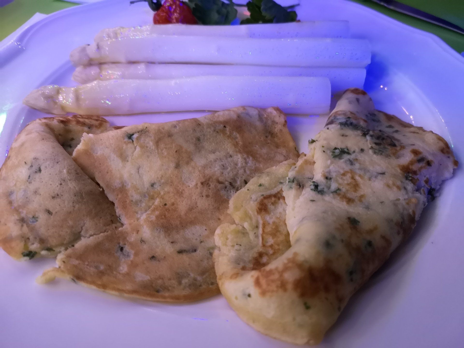 Damit wir einen schönen Platz mit Stromanschluss bekommen, sind wir schon am frühen nachmittag angereist. Da war dann auch schon die Hölle los. Trotzdem wurden wir freundlich begrüsst, haben gleich mal Besteck und die Karte bekommen. Eigentlich haben wir unsere Menüs - "Pincho" für Hansi und "Elmo" für mich - schon vorbestellt. Doch da gab es noch einen Hinweis auf der Tagestafel: Frischer weisser Spargel mit Pfannkuchen, Schicken und Sauce Hollandaise..... Oh mein Gott, da kann ich nicht nein sagen. Also noch schnell umbestellt und statt Schokotörtchen das Vanilleeis mit heissen Himbeeren geordert - alles kein Problem - und mit dem 1. Apéritif - Apérol Spritz - angefangen. So kann das Wochenende starten.