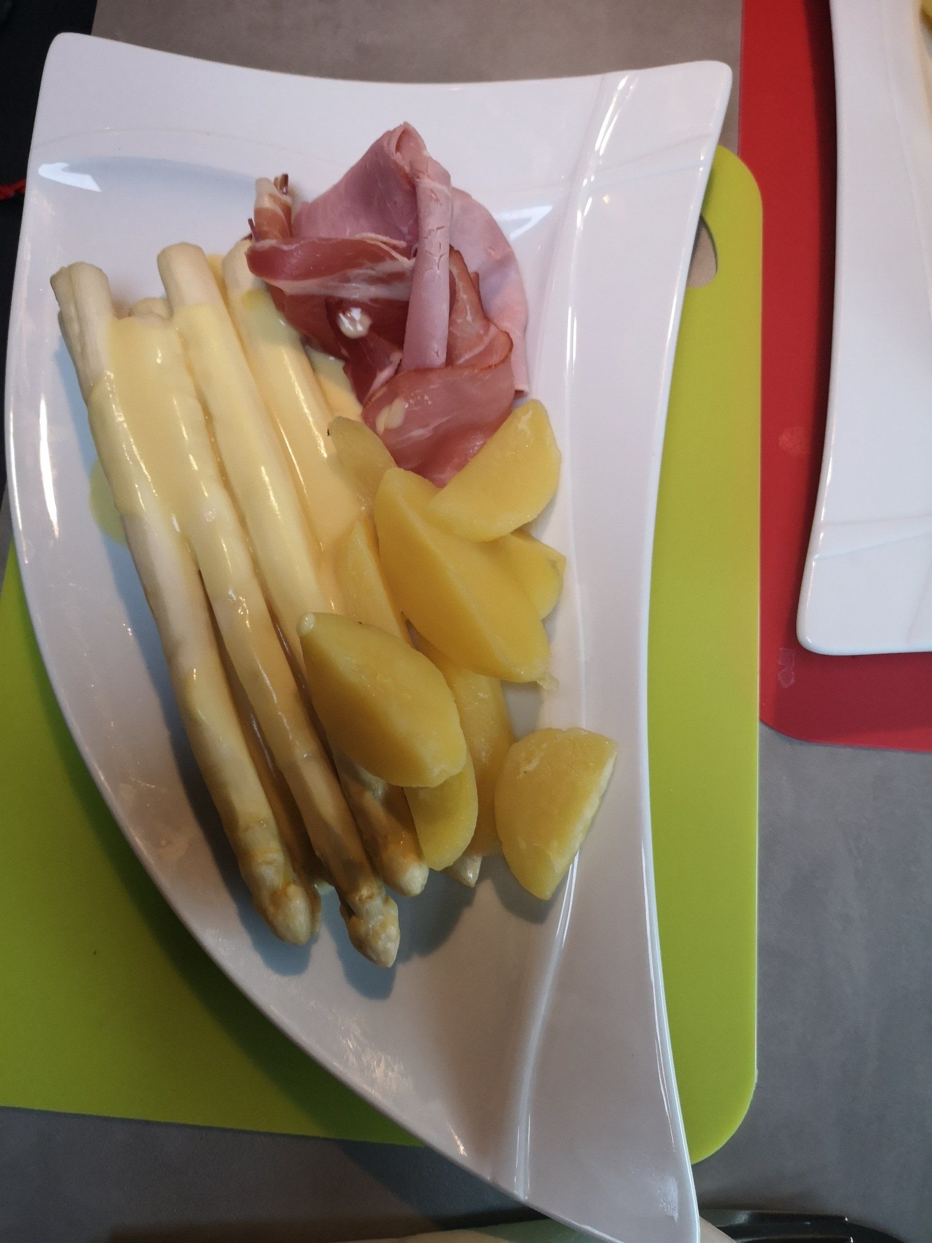 Bis die Hauptspeise - Hansi ist beim Rostbraten geblieben, ich hatte ja frischen Spargel - hat es dann zwar doch recht lange gedauert, aber man sitzt ja im eigenen "Heim" und hat immer was zu tun. Allo kein Problem. Und es war wieder soooooo lecker. Da wartet man gerne noch ein bisschen.