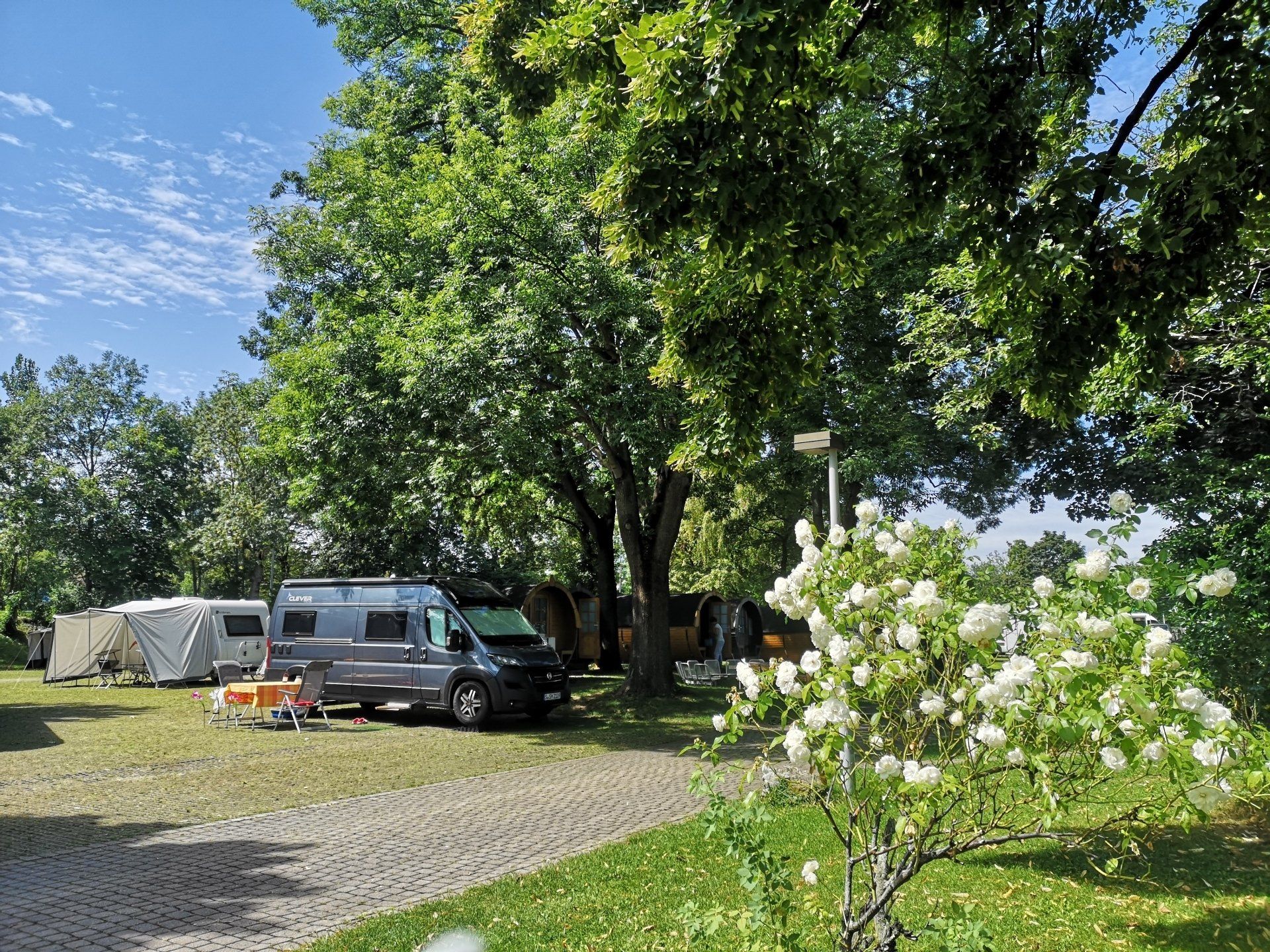 Als wir dann dort ankamen, haben wir unseren Augen nicht getraut: Eine ganze Wiese voll mit Wohnmobilen, gut 40 bis 50 Stück. Wir werden sehr freundlich begrüsst, dann bekommen wir einen Platz zugewiesen und dann - wir konnten es kaum glauben - durften wir auch Strom anschliessen. Volltreffer!