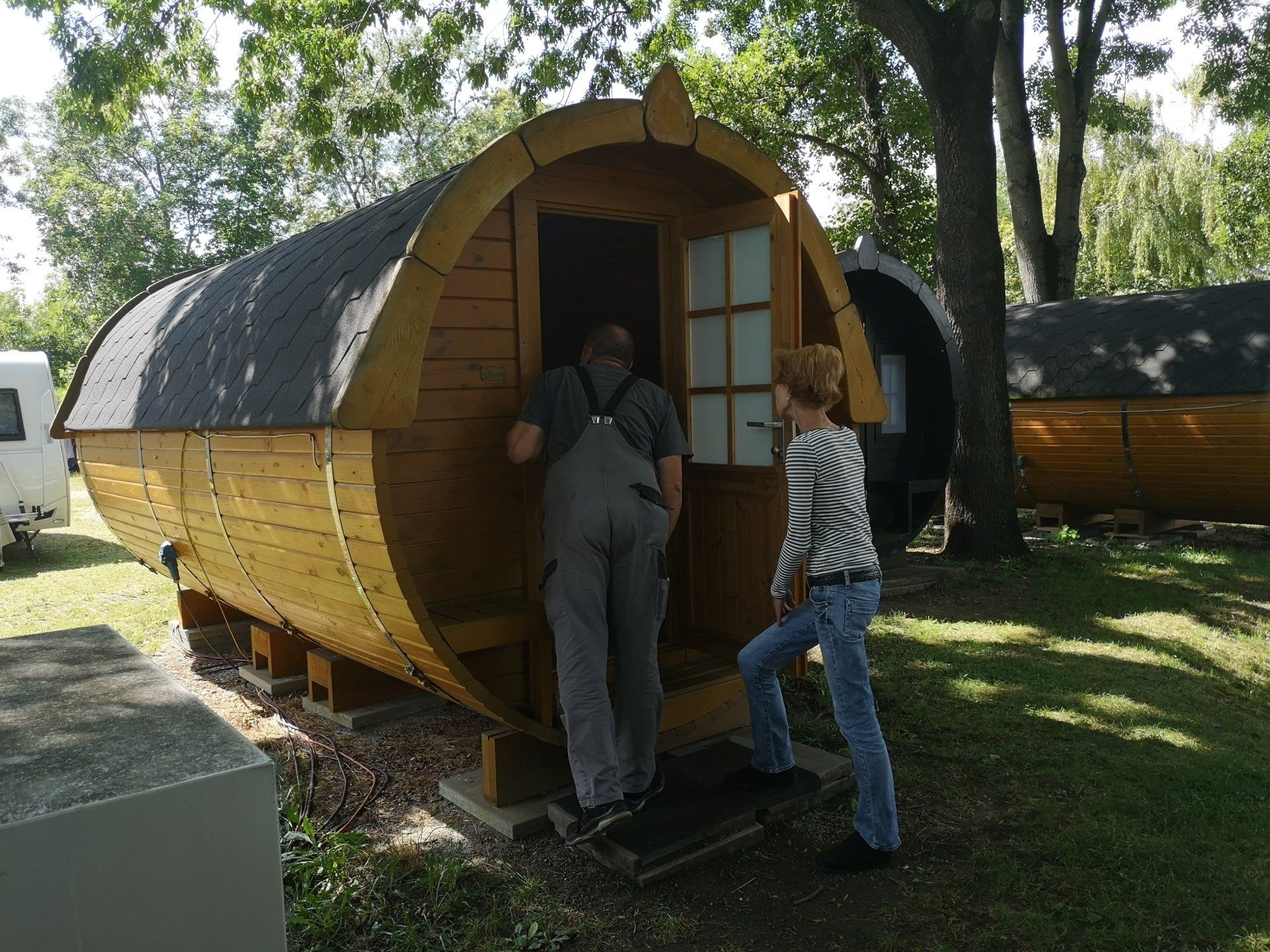 Dann endlich kam der langersehnte Dienstag. Der Bus war pünktlich, aber wo blieb Tina? Verschollen am Cannstatter Wasen.... . Endlich war sie dann da. Und die Begrüssung viel entsprechend aus. Sie konnte ihr Schlaffass gleich beziehen - oh was für eine tolle Sache - und dann haben wir es uns beim Camper gemütlich gemacht. Es gab ja so viel zu erzählen. Und es gab jede Menge "Mitbringsel": Das neueste "Lustige Taschenbuch Camping", eine solarbetriebene Wackelblume und ein Betthupferl für Tina und weil mir Tina eine "Champagnersause" versprochen hat gab es für mich tatsächlich einen Champagner mit campinggerechtem Kühler und personalsierte Campingaufkleber, damit wir ihn Zukunft immer unseren eigenen Campingsekt haben. Was für eine tolle Idee.