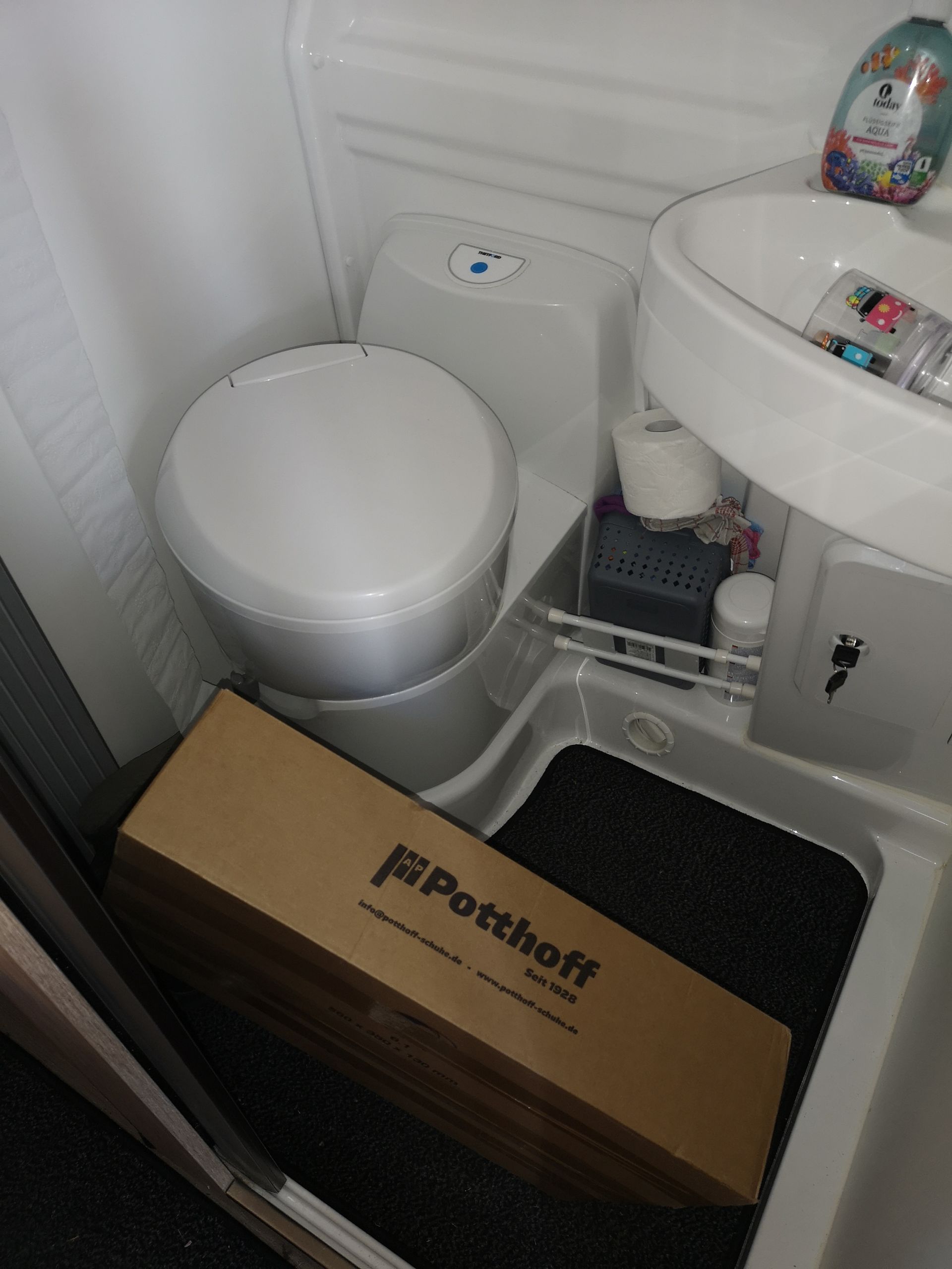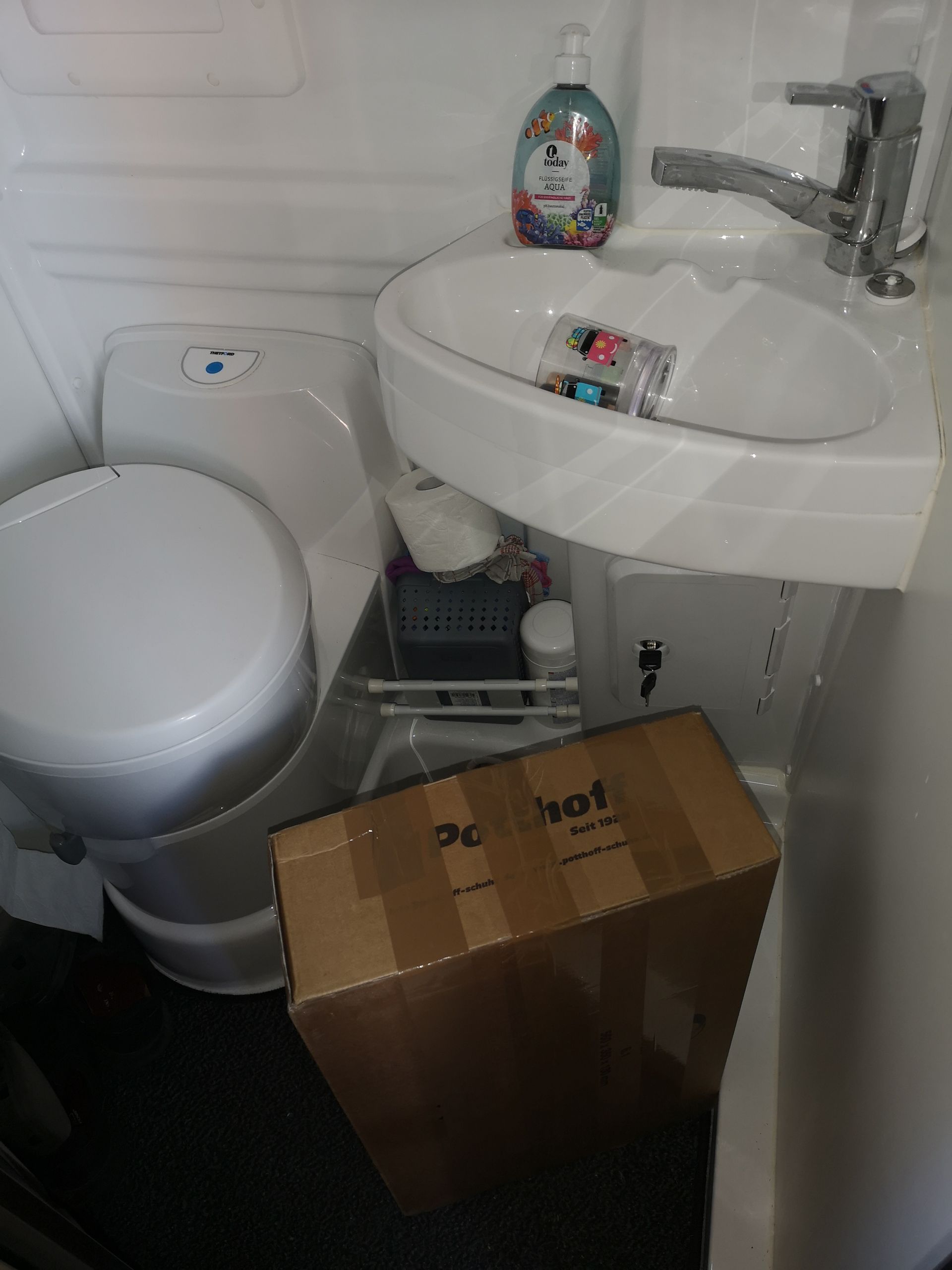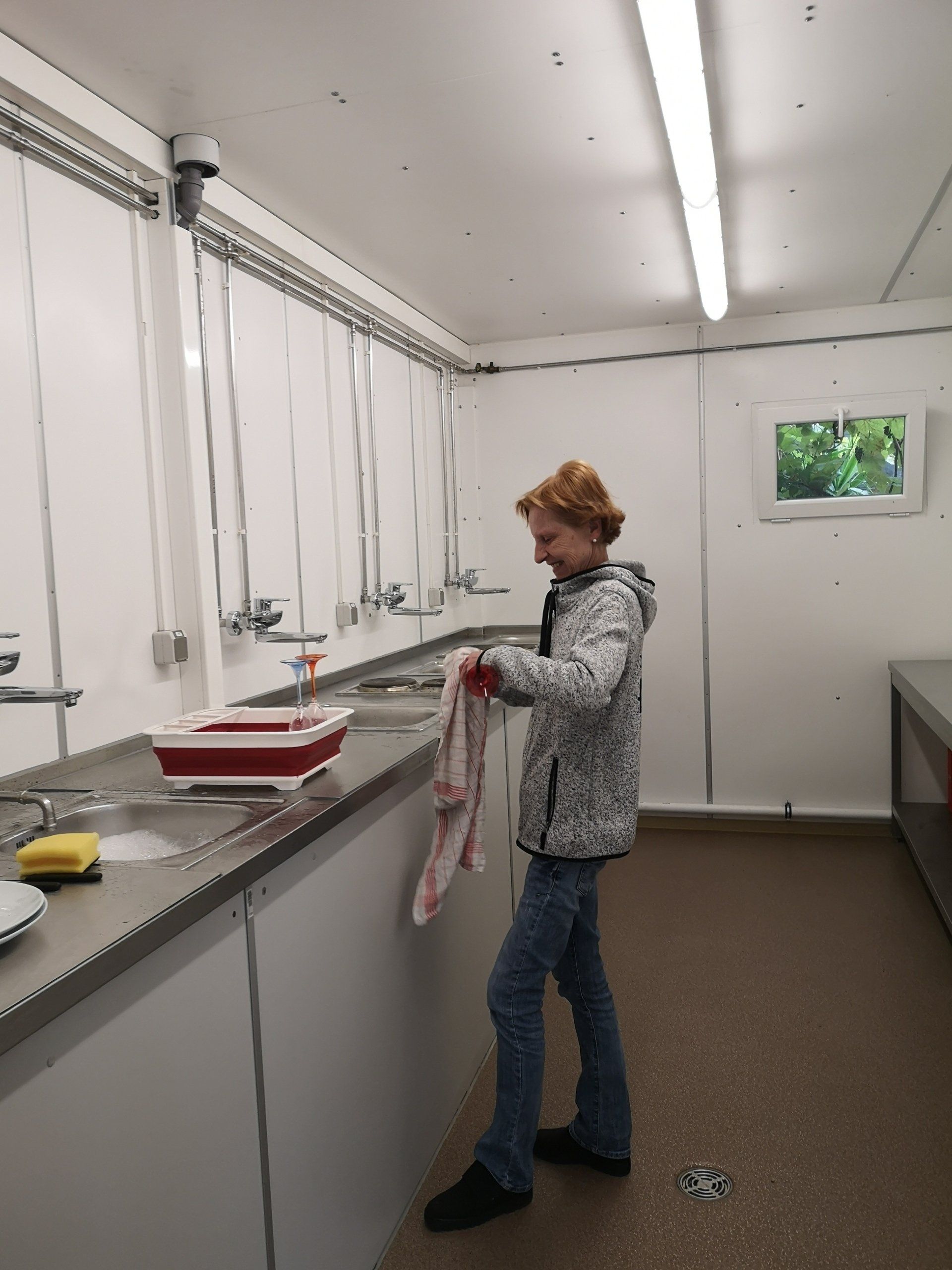 Während ich noch friedlich geschlafen habe, war Tina schon aktiv: Sie war duschen und hat Brötchen geholt. Somit stand einem ausgiebigen Frühstück nichts im Wege - mit Eszet-Schnitten. Aber irgendwann muss frau auch die lästige "Camperpflicht" erledigen: Spülen. Doch zu zweit geht alles besser. Nun war es auch Zeit, dass sich Tina von ihem Schlaffass verabschiedet.