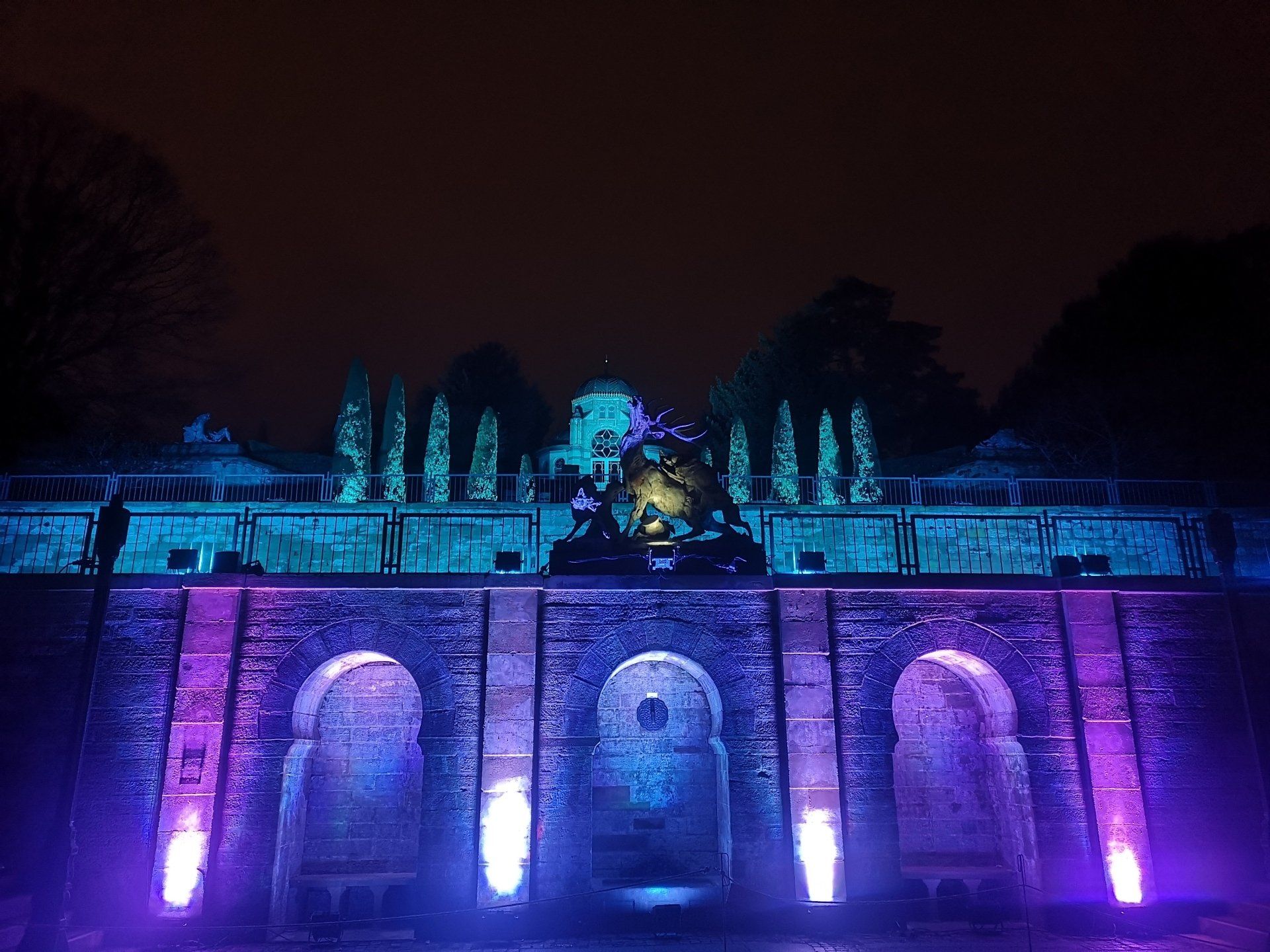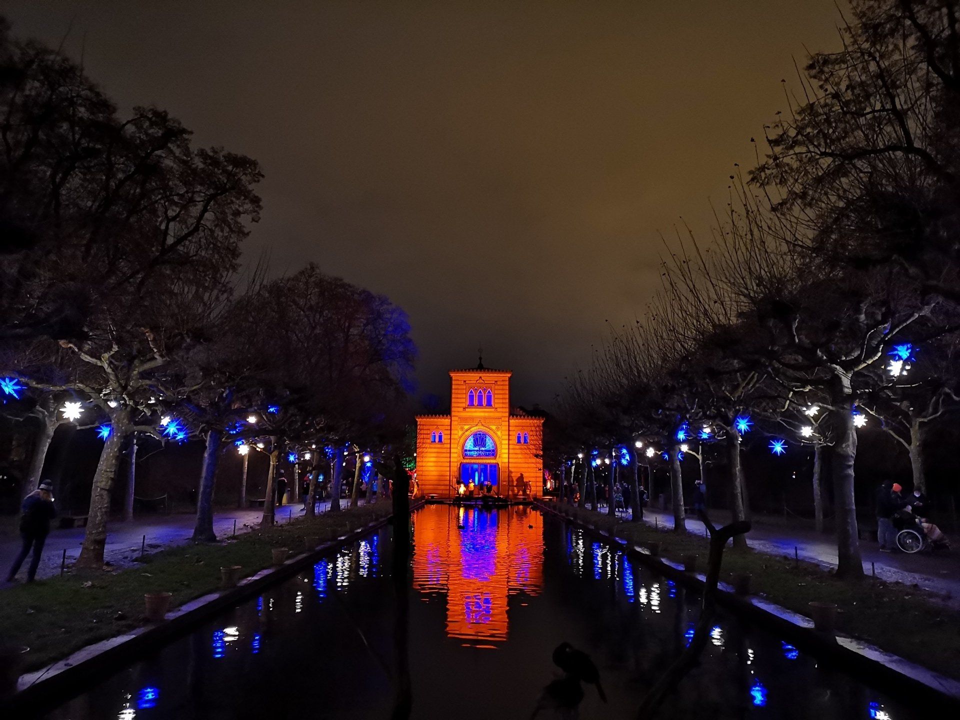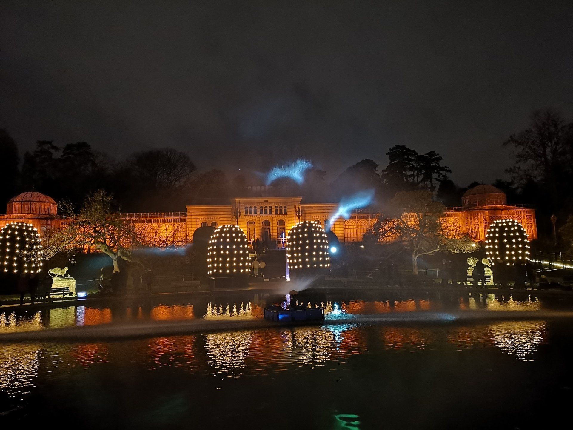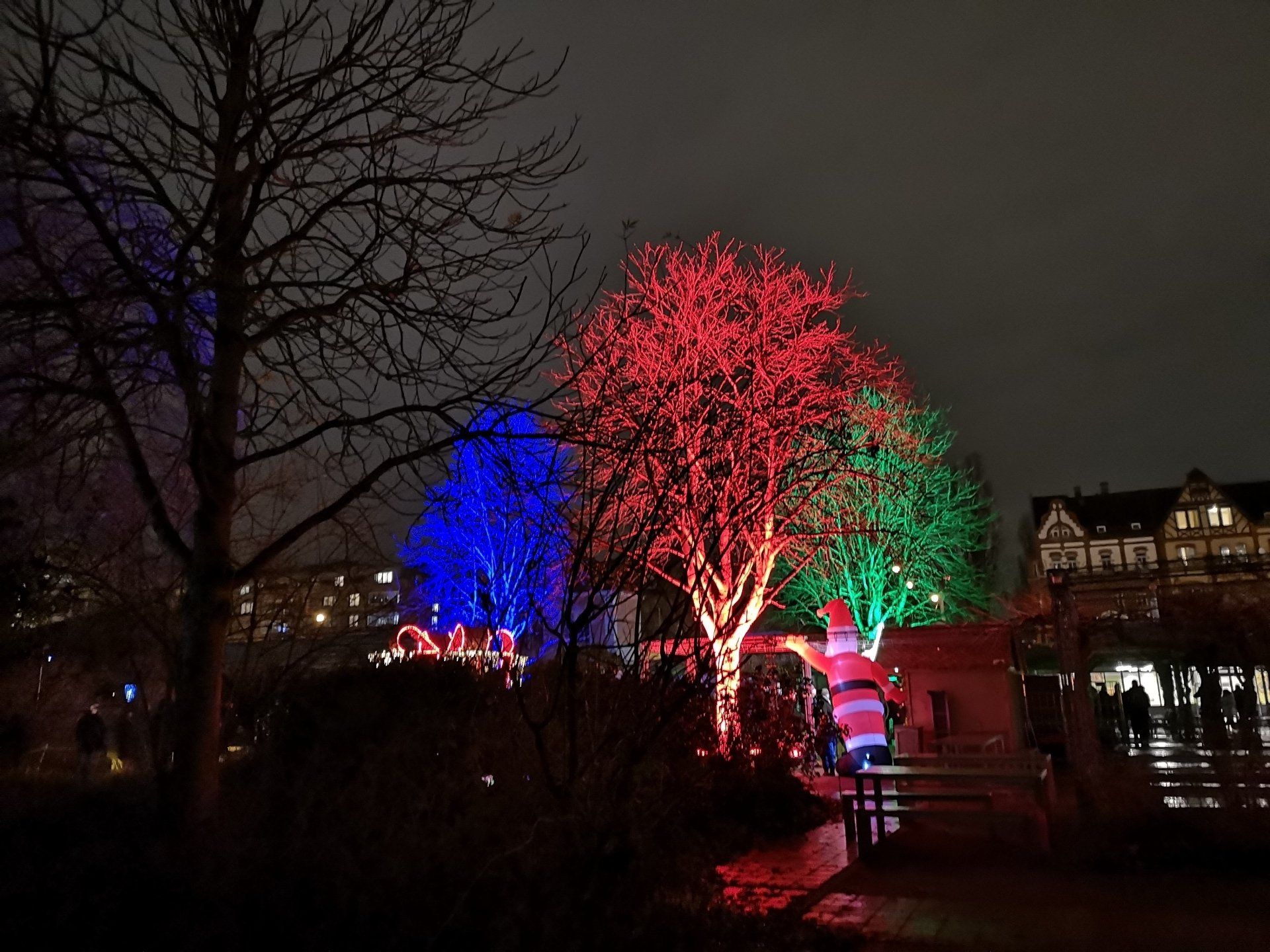 Unterwegs gibt es immer wieder Glühwein- und Fressstände mit dem üblichen Angebot. Dort ist es meist voller und es gibt auch lange Schlangen. Nichts für uns. An einem Glühweinstand hatten wir aber Glück: Keiner da, also ganz schnell zwei Glühwein geholt. Das gehört einfach dazu. Der geht dann aber auch directement in den Kopf. Unterwegs werden wir immer wieder von Ordnern darum gebeten, die Masken aufzuziehen. Warum das denn, wir sind doch im Freien? Um die Tiere hier zu schützen. Ok, dann halt für die Tiere. Gut gefallen hat uns die Installation am Brunnen, das Wassermärchen, und der Zauberwald mit dem magischen Hologramm. Alles wirklich sehr schön gemacht und oft auch noch musikalisch untermalt. Obwohl wir uns wirklich Zeit genommen haben und auch viel fotografiert haben, waren wir in einer guten Stunde durch. Das hat dann auch gereicht - es war nämlich schon ganz schön kalt.