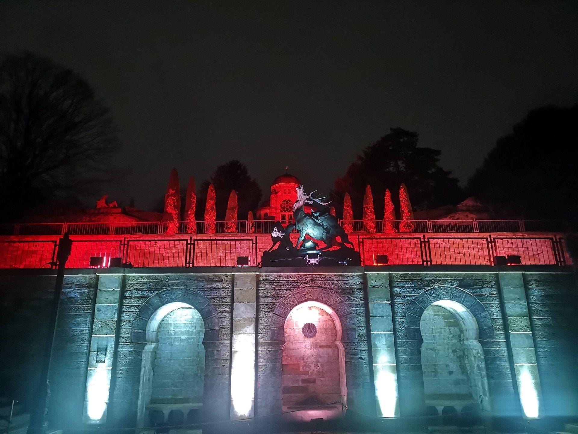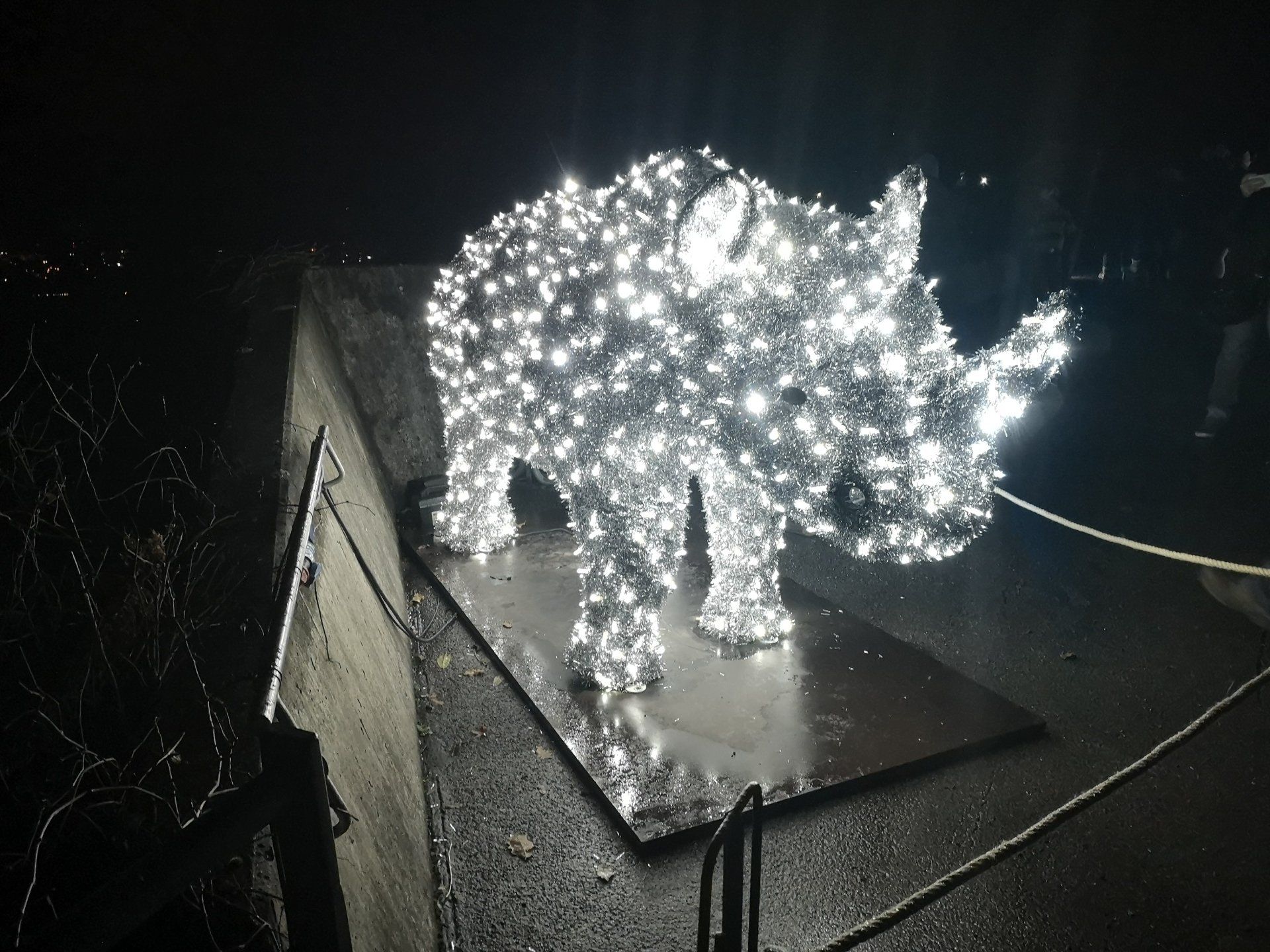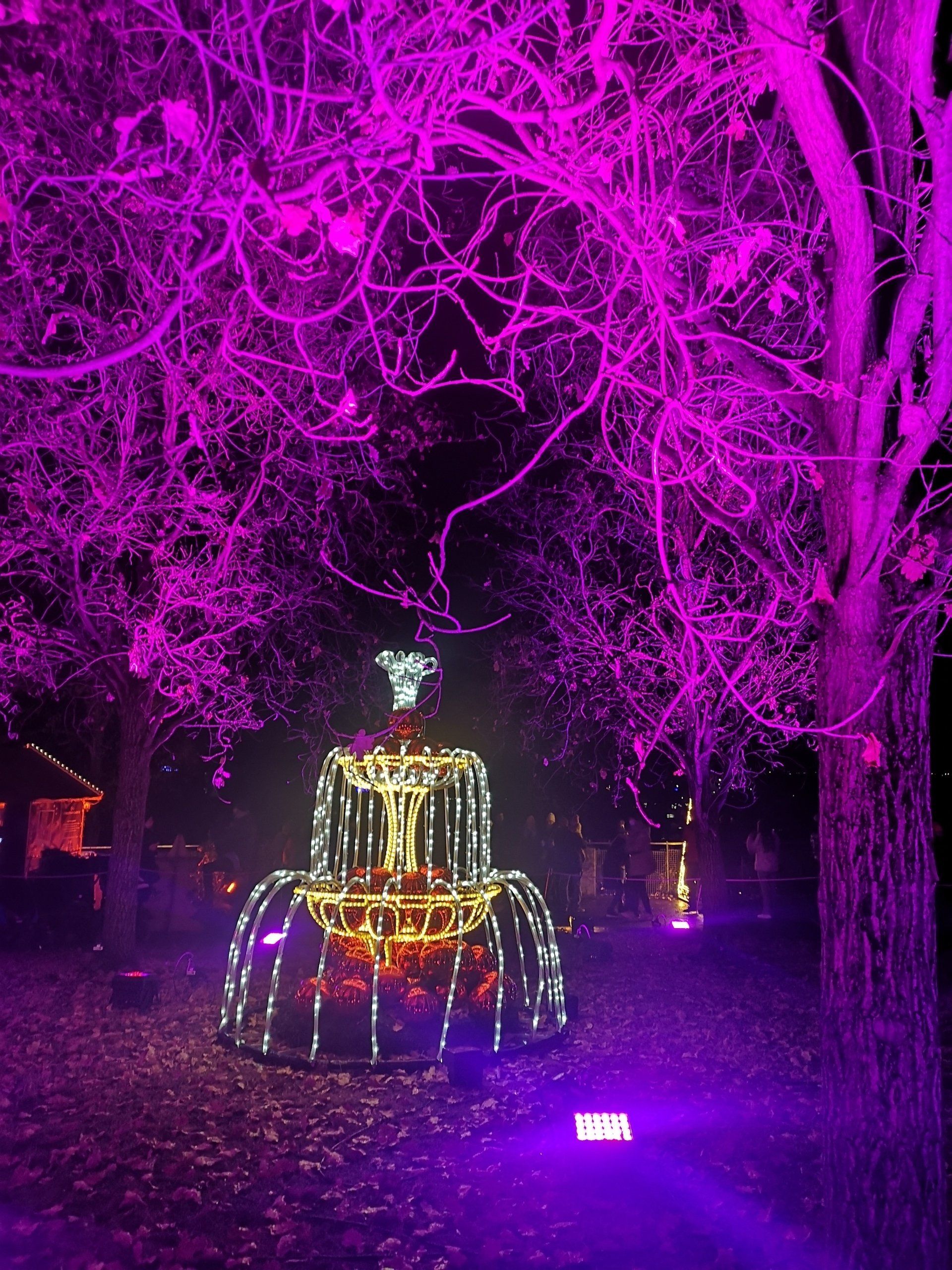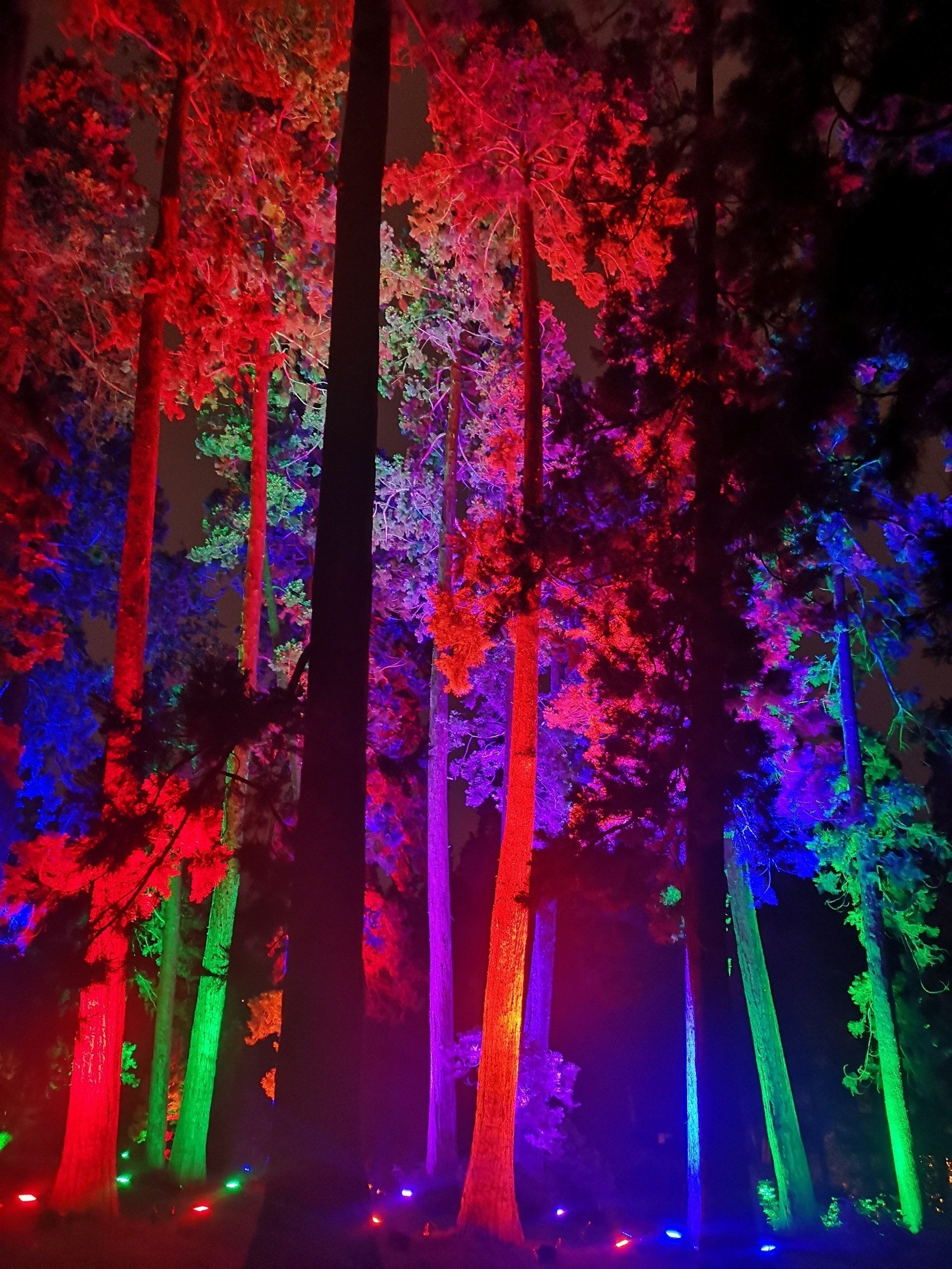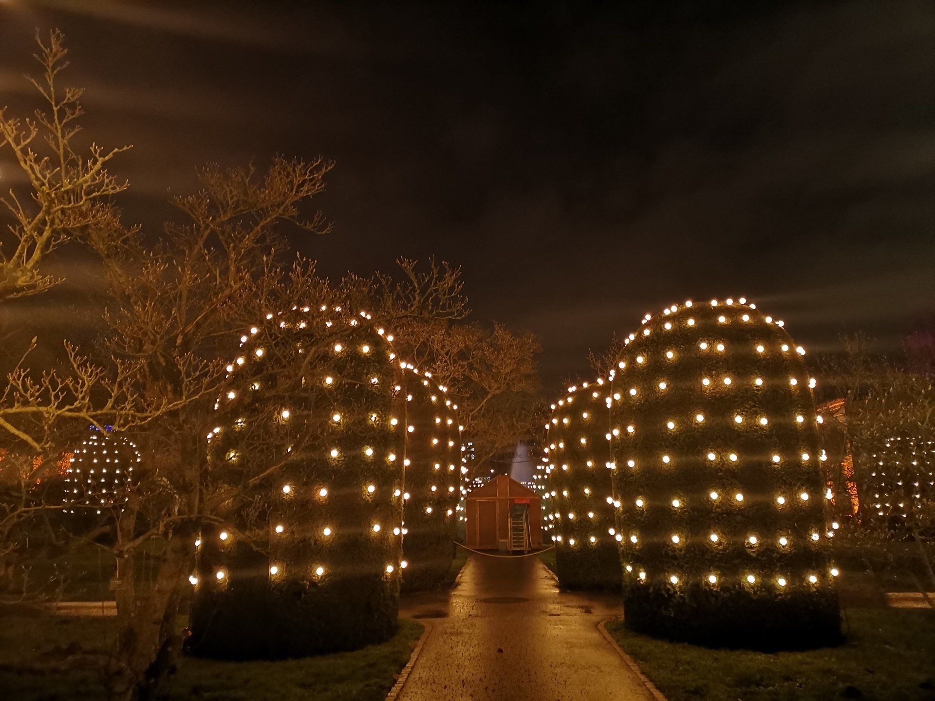 Unterwegs gibt es immer wieder Glühwein- und Fressstände mit dem üblichen Angebot. Dort ist es meist voller und es gibt auch lange Schlangen. Nichts für uns. An einem Glühweinstand hatten wir aber Glück: Keiner da, also ganz schnell zwei Glühwein geholt. Das gehört einfach dazu. Der geht dann aber auch directement in den Kopf. Unterwegs werden wir immer wieder von Ordnern darum gebeten, die Masken aufzuziehen. Warum das denn, wir sind doch im Freien? Um die Tiere hier zu schützen. Ok, dann halt für die Tiere. Gut gefallen hat uns die Installation am Brunnen, das Wassermärchen, und der Zauberwald mit dem magischen Hologramm. Alles wirklich sehr schön gemacht und oft auch noch musikalisch untermalt. Obwohl wir uns wirklich Zeit genommen haben und auch viel fotografiert haben, waren wir in einer guten Stunde durch. Das hat dann auch gereicht - es war nämlich schon ganz schön kalt.
