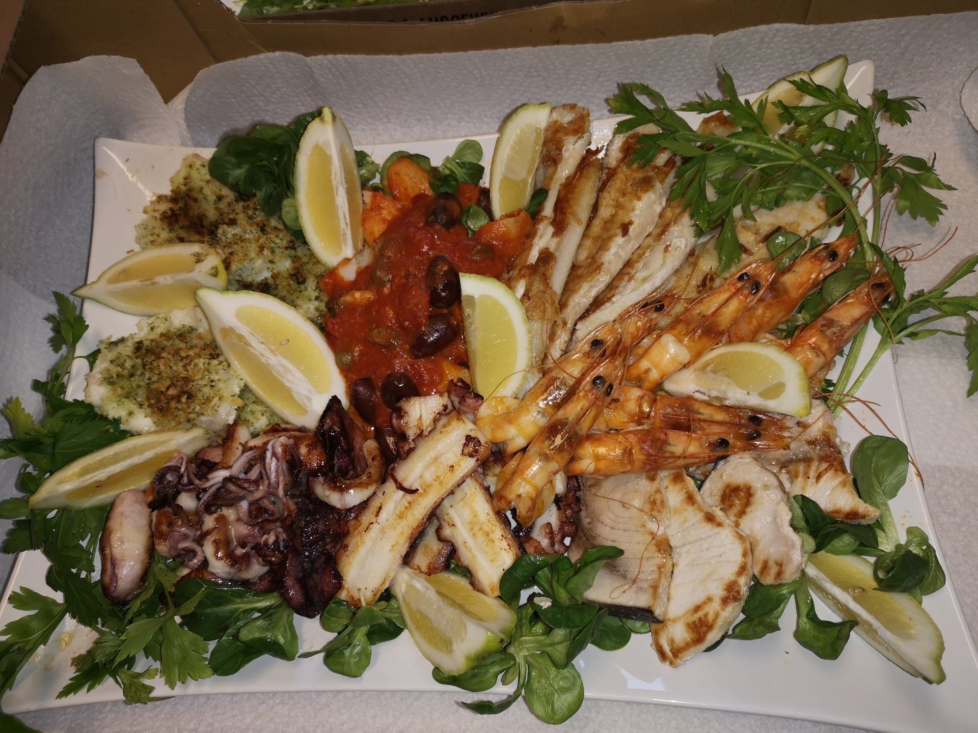 Ponte Vecchio" in Weissach im Tal bieten Fischplatte mit Risotto und Salat zum Abholen an. Das hört sich gut an - Weihnachten war gerettet.