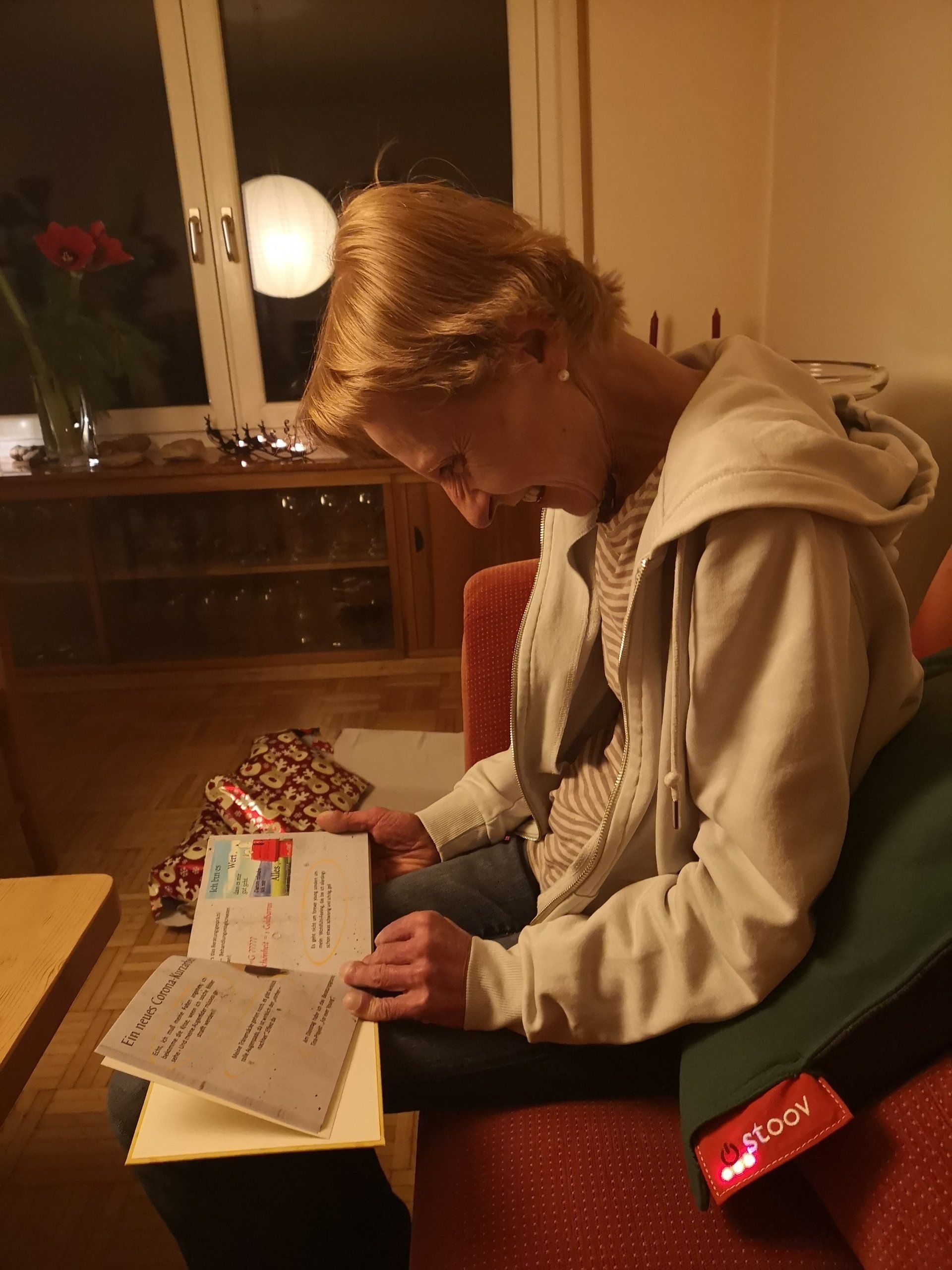 Das erste Geschenk für Tina – ohhhhhhh ein ganz persönlicher Jahresrückblick. Am liebsten hätte sich Tina in eine Ecke verzogen und gleich alles gelesen und angeschaut. Doch die anderen haben schon gewartet. Was gibt es noch? Damit Martin nicht leer ausgeht, eine gute Flasche Wein aus den Corbières und dann kam wieder Tina an die Reihe. Was ist denn das? Das ist ja warm. Ein mit USB beheizbares Kissen – ihr ist immer soooo kalt. Das soll sich nun ändern.