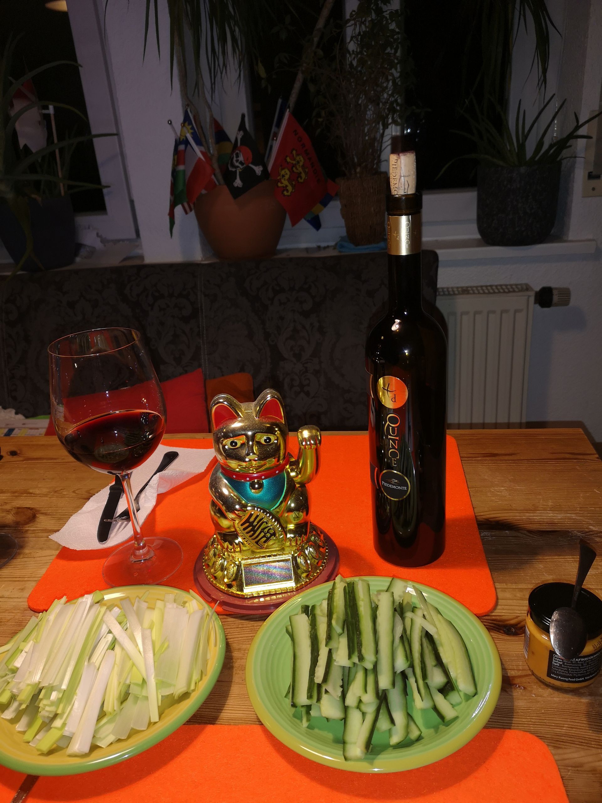 Mary Kwong hat uns ja eine Geschmacksexplosion versprochen. Wir haben noch nie Pekingente gegessen und waren gespannt. Hm, nach Ente schmeckt es schon - aber eine Geschmacksexplosion? Na ja. Das mit den Pfannküchlein, auf die man die Hoisin Sauce (extrem lecker) verteilt, dann mit Gemüse und Entenscheiben belegt und dann einrollt, hat gut geklappt. Die Ente war nicht schlecht und wir sind satt geworden. Doch die Kochbox werden wir sicherlich nicht wieder bestellen. Und das Schlimmste: Auch der Wein hat nicht überzeugt.