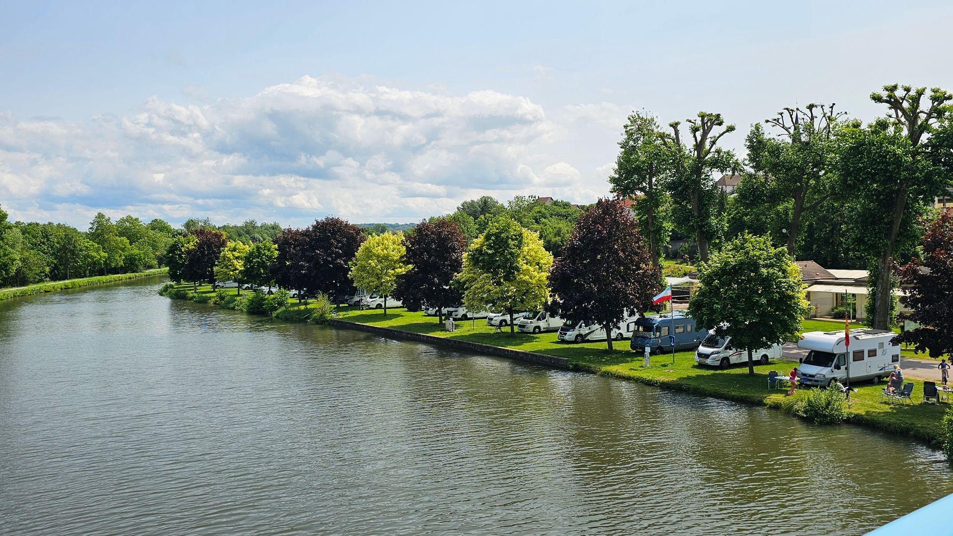 ist in Dillingen in Luxemburg und liegt direkt an der Sauer, dem Grenzfluss zu Deutschland. Der Campingplatz bietet Platz für 180 Camper (und etwa 80 Dauercamper) und viele dieser Plätze liegen direkt am Fluss, naja eher Flüsschen. Alle Plätze haben Strom (6 Ampere), aber keinen eigenen Wasseranschluss.