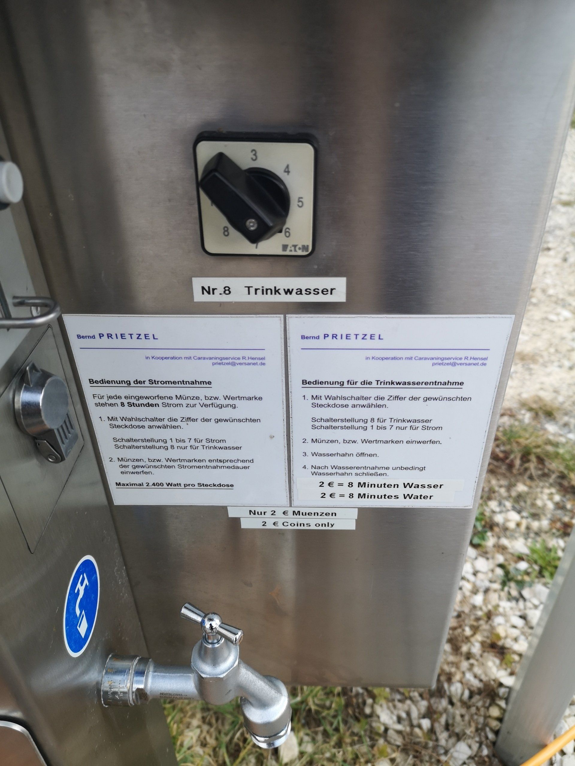 Für den Platz bezahlt man Euro 8,50, 13 Euro pro Person, Stromanschluss 3 Euro (einmalig) und 1 Euro pro kWh plus 3 Euro Tourismusabgabe.